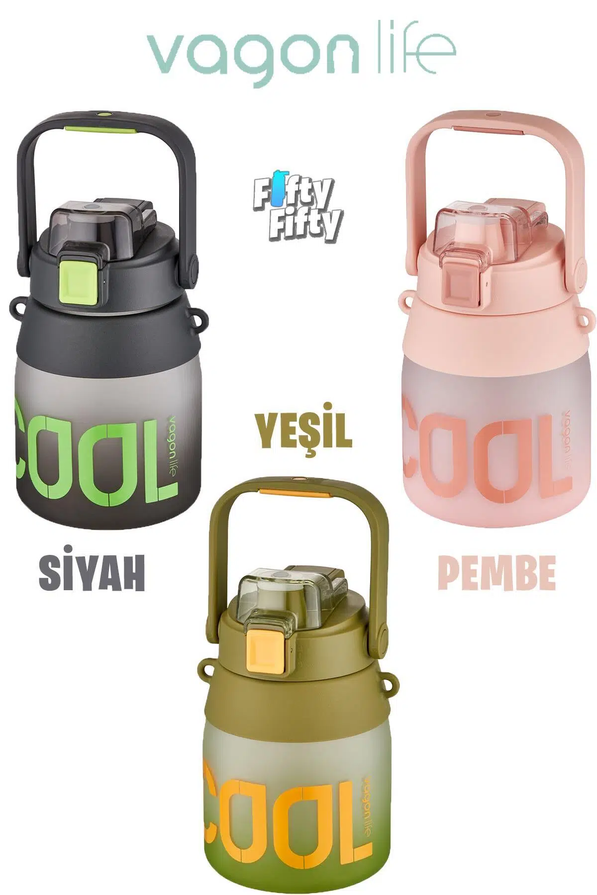**FiftyFifty siz değerli müşterilerimiz için çok sevdiğiniz Vagonlife ailesinin Vagonlife 1000ml ASKILI Tek Kapak Çift Kullanım Pipetli/Pipetsiz Kullanım SoftTouch Su Matarası ilanlarını tüm renklerini satın almada kolaylık için tek ilana getirdi; **ÜRÜN ÖLÇÜLERİ DİKKAT: Boy:18; 5 En:10; 5cm Kapasite:1000ML ürünün boş ağırlığı 265 gram**PİPETLİ VE PİPETSİZ KULLANIMA UYGUNDUR; Ürün tek kapak iki ayrı ağızlıklıdır; **Taşıma KULBU bulunmaktadır; AYRICA TAŞIMA BOYUN ASKILIĞI BULUNMAKTADIR; **BPA YOK KOKU YOK SIZDIRMA YOK**Tüm ürünler T; K; I; B nın testlerinden pozitif onay olarak ithalatı yapılmıştır; **3 farklı renk Siyah; Yeşil; Pembe**FiftyFifty magazamızdan aldıgınız ürünler birebir aynı renk gönderilmektedir ve mesai günleri içinde siparişleriniz 24 saatte içinde size ulaştırılmak üzere kargolanmaktadır**İlk görsellerdeki renkler ürünün rengini belirtmektedir; Tüm renkler için ilan altındaki varyasyonları inceleyebilirsiniz; **LÜTFEN DİKKAT: SU MATARALARINI ASLA KAYNATMAYINIZ STRELİZASYON CİHAZINA KOYMAYINIZ**Bulaşık makinasında yıkanması üründe çiziklere ve zamanla makinanın yıkama esmasında kötü kokuların mataraya sinmesine sebebiyet verebilmektedir; **ÜRÜN ELDE YIKANMAYA UYGUNDUR; **Her kullanımdan sonra mataranın elde yıkanması ve kullanılmadığı zamanlarda kapağın açık olarak saklanması önerilir; **Ürün içerisine sıcak ve soğuk sıvılar koyabilirsiniz; (; 10 +90 derece) (yalıtım özelliği bulunmamaktadır sadece çelik ürünlerde vardır)**Ürünü satın aldıktan sonra içerisinde bulunan silika jeli(nem alıcı paket)imha ediniz;