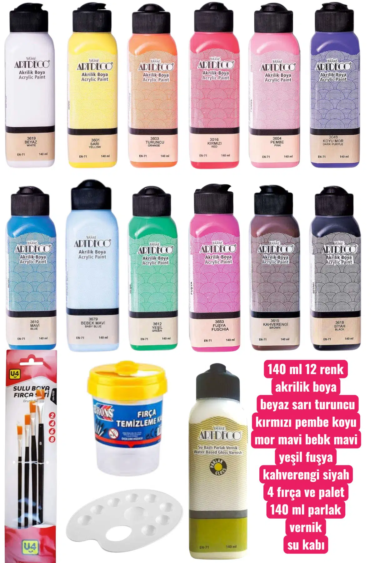 140 ml 12 renk akrilik boya seti 4 fırça palet 140 ml parlak vernik su kabı ahşap boyama seti sanat seti