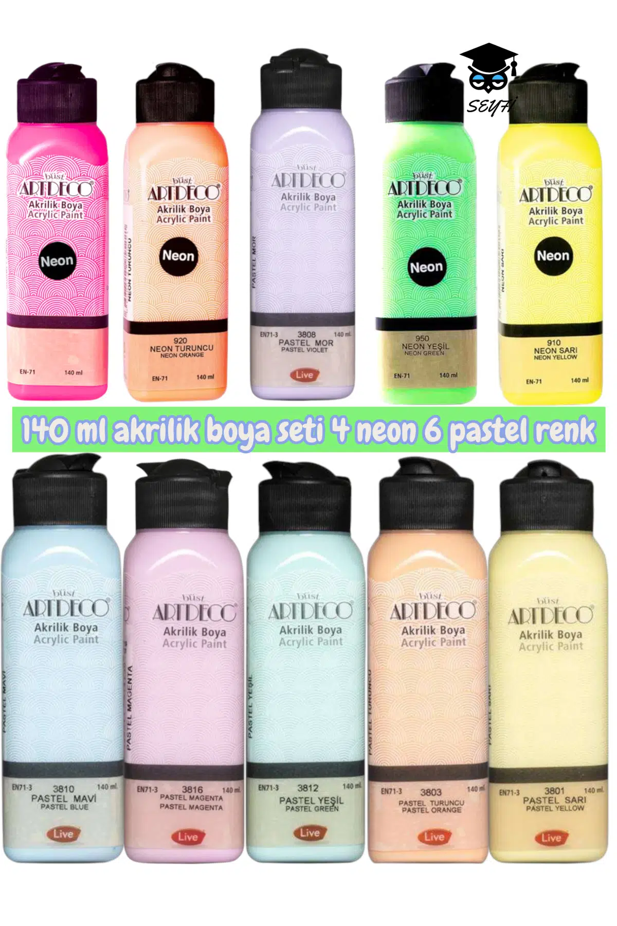 140 ml akrilik boya seti 4 neon 6 pastel renk artdeco 10 adet