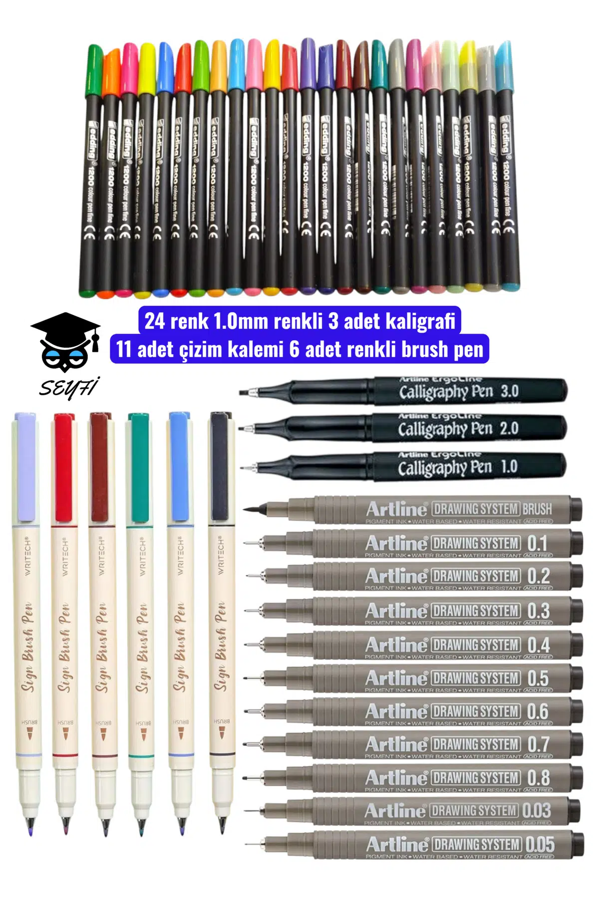 24 renk 1.0mm renkli 3 adet kaligrafi 11 adet çizim kalemi 6 adet renkli brush pen KALİGRAFİ SETİ 24 ADET EDDİNG 1200 TÜKENMEZ KALEM 3 ADET ARTLİNE KALİGRAFİ KALEMİ 11 ADET ARTLİNE ÇİZİM KALEMİ 6 ADET WRİTECH BRUSH ÇİZİM KALEMİ