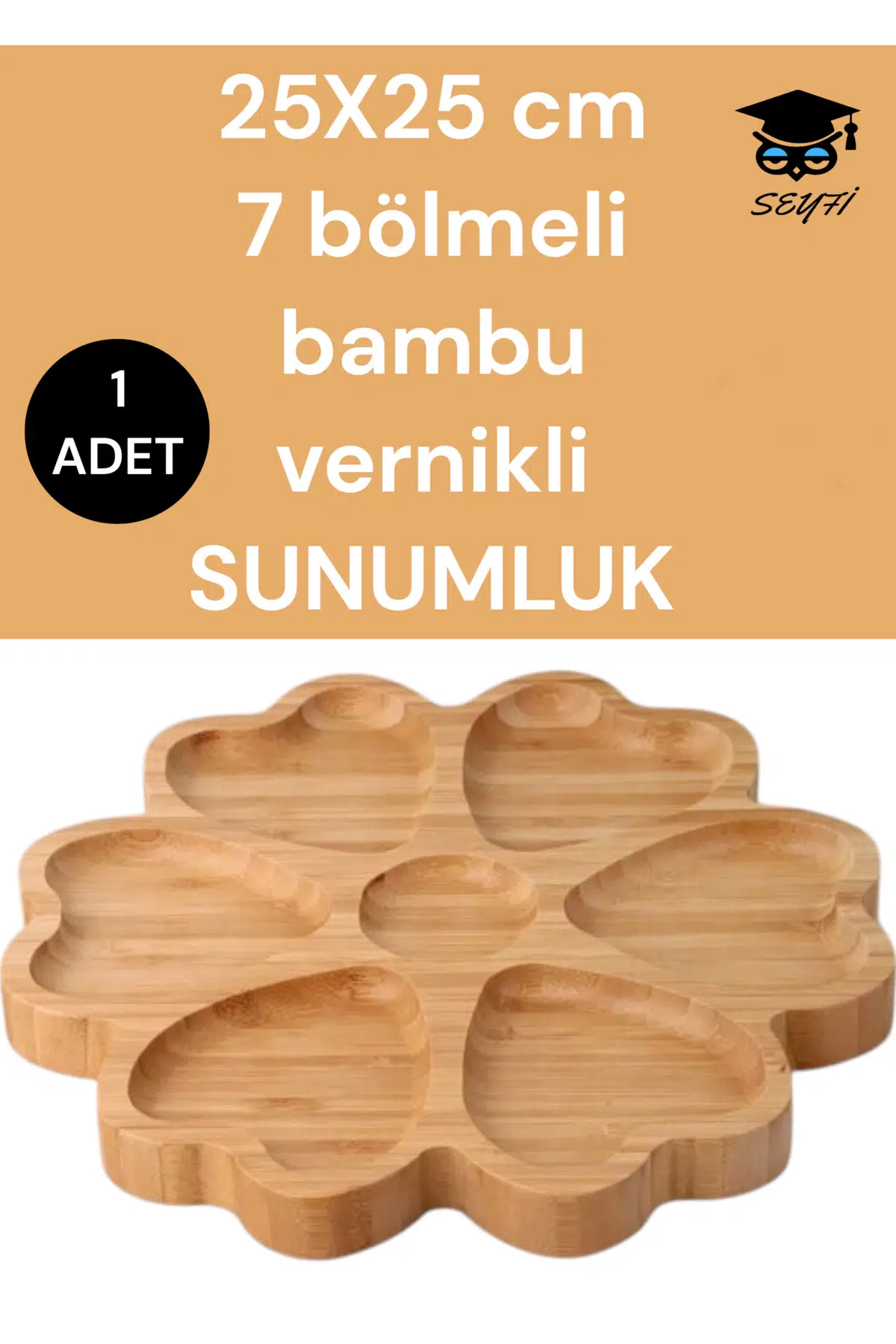 - 25x25 cm boyutlarındaki bu şık sunumluk atıştırmalıklarınız için idealdir.; - Yedi ayrı bölmeden oluşan tasarımı sayesinde farklı çerezleri meyveleri ayrı ayrı yerleştirebilir ve sunabilirsiniz.; - Bambu vernikli yapısı ile doğal bir görünüm sunarken, dayanıklılığı ve uzun ömürlü kullanımı garanti eder.; - Bambu malzemesi, çevre dostu bir seçenek olarak öne çıkarken, estetik ve fonksiyonelliği bir arada sunar.;