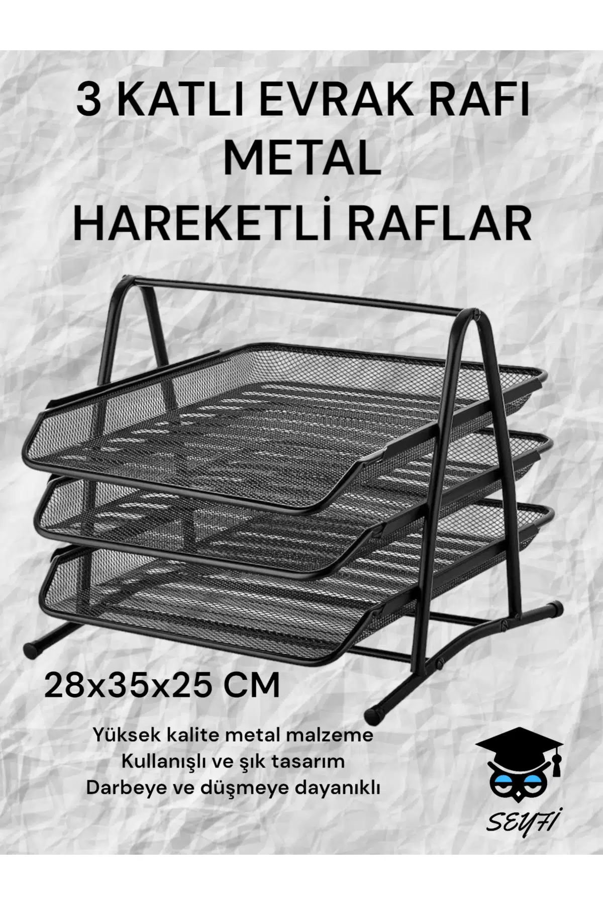 3 KATLI METAL EVRAK RAFI PERFORE SİYAH HAREKETLİ RAFLAR 3 rafıda hareketlidir, dilediğiniz rafda evrağınızı hızlıca bulabilirsiniz. ; Geniş iç kapasitesiyle masanızdaki A4 evraklarınızı düzenli tutmanızı sağlar. ; Yandan korumalı tasarımı sayesinde evraklarınız güvenli şekilde tutar. ; Paslanmaz nikel kaplamalı metalden üretilmiştir, SİYAH renktir. ; Cildinize zarar vermemesi için özel kaliteli metal ile üretilmiştir.;