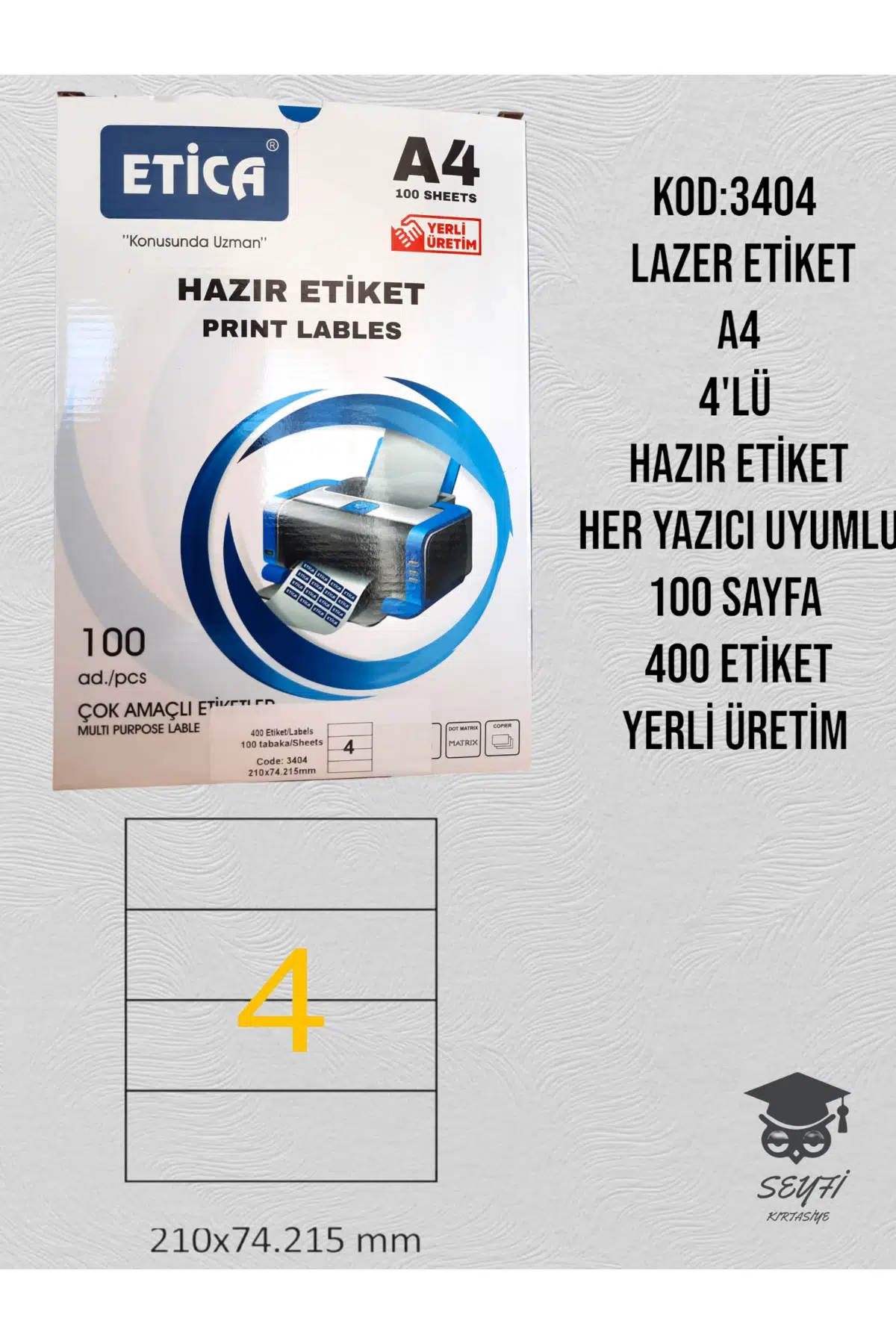 A4 boyutunda, her yazıcı ile uyumlu 3404 lazer etiket, ofis ve ev kullanımına uygun; 100 sayfa kapasiteli bu etiketler, belgelerinizi hızlı ve kolay bir şekilde etiketlemenizi sağlar; Yerli üretim avantajıyla kaliteli ve dayanıklı yapısı, uzun süreli kullanım için idealdir; Beyaz fotokopi kağıdı sayesinde yazıcıdan çıktısı kolay ve net olur, belgelerinizde şık bir görünüm sunar;