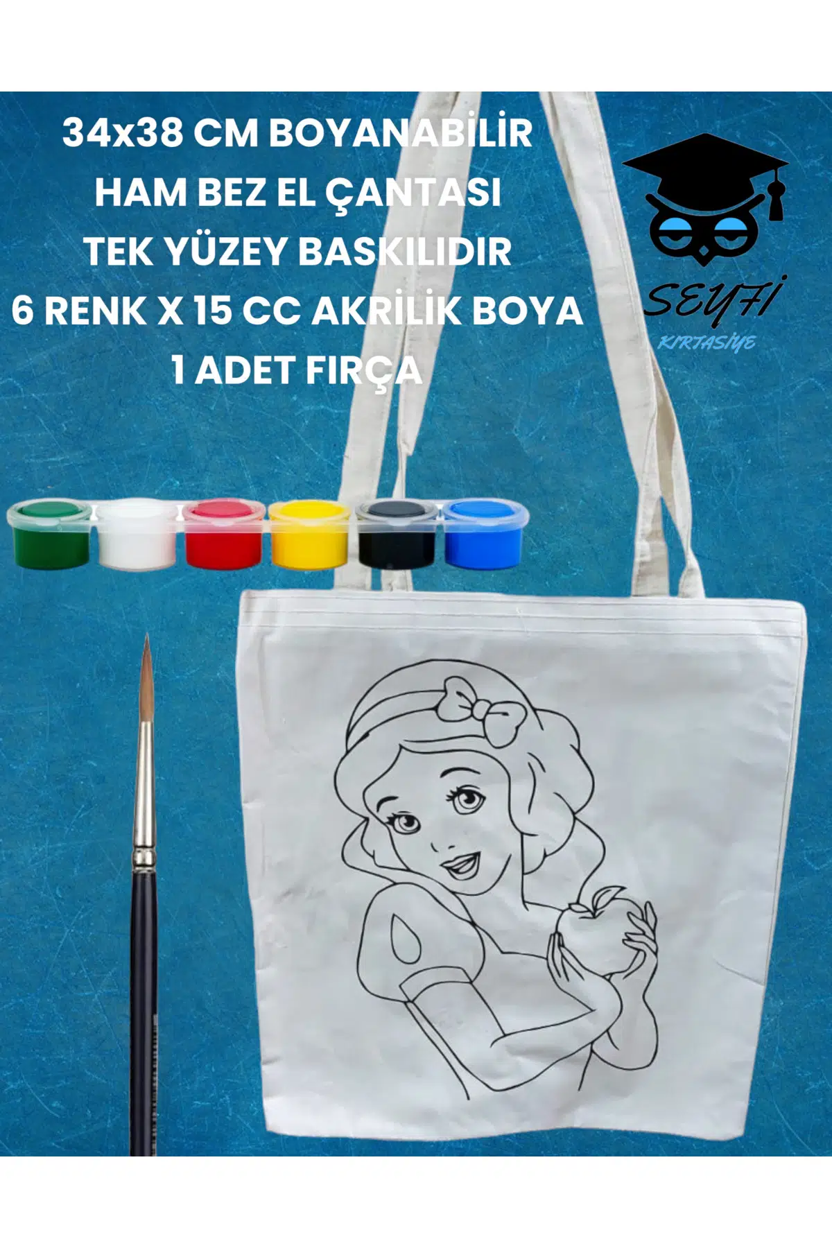 34x38 CM BOYANABİLİR HAM BEZ EL ÇANTASI TEK YÜZEY BASKILIDIR 6 RENK X 15 CC AKRİLİK BOYA 1 FIRÇA