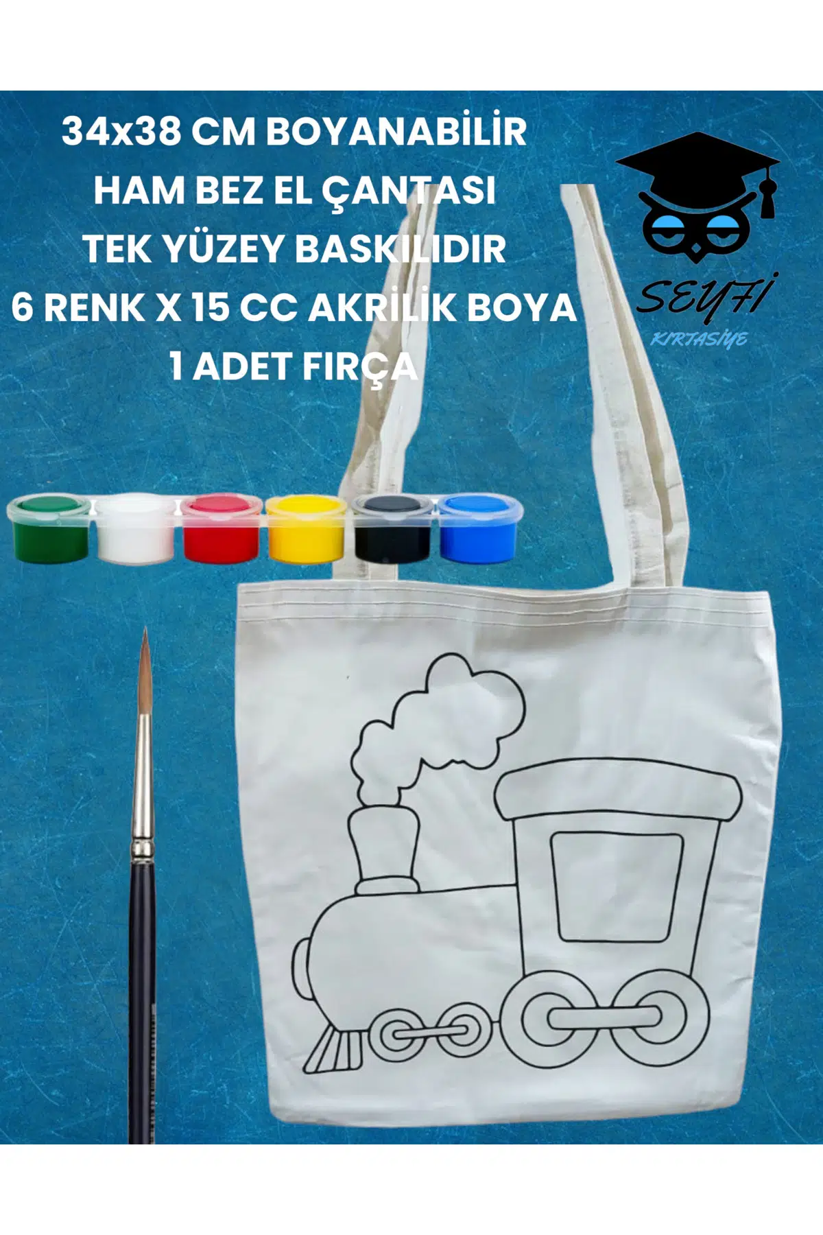 34x38 CM BOYANABİLİR HAM BEZ EL ÇANTASI TEK YÜZEY BASKILIDIR 6 RENK X 15 CC AKRİLİK BOYA 1 FIRÇA