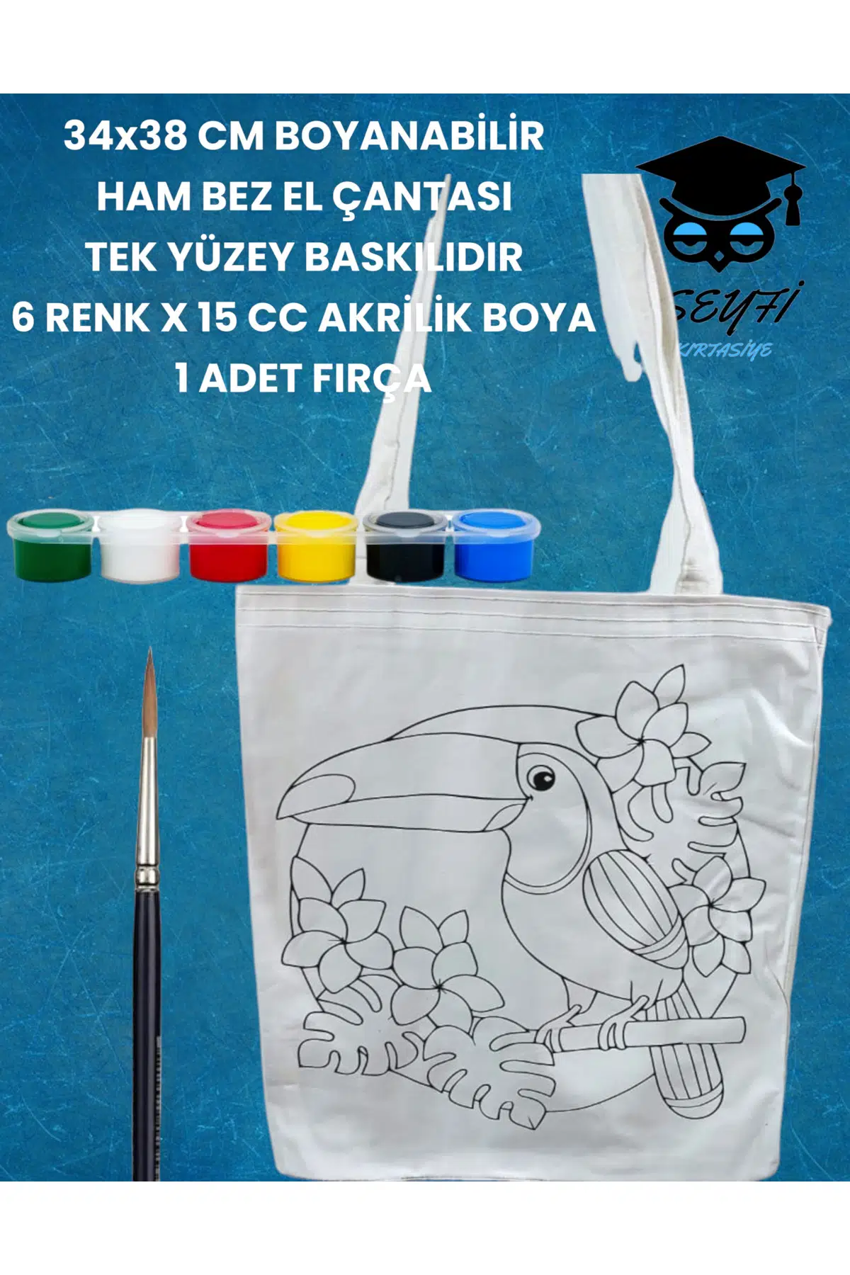 34x38 CM BOYANABİLİR HAM BEZ EL ÇANTASI TEK YÜZEY BASKILIDIR 6 RENK X 15 CC AKRİLİK BOYA 1 FIRÇA