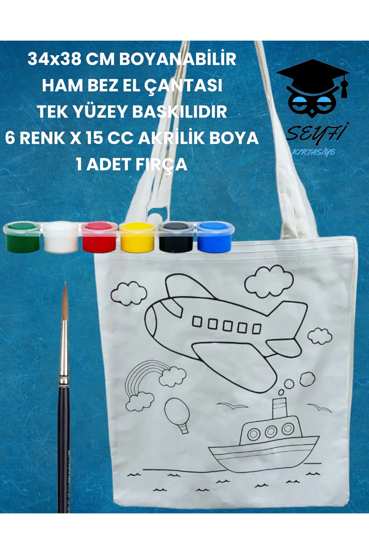 34x38 CM BOYANABİLİR HAM BEZ EL ÇANTASI TEK YÜZEY BASKILIDIR 6 RENK X 15 CC AKRİLİK BOYA 1 FIRÇA