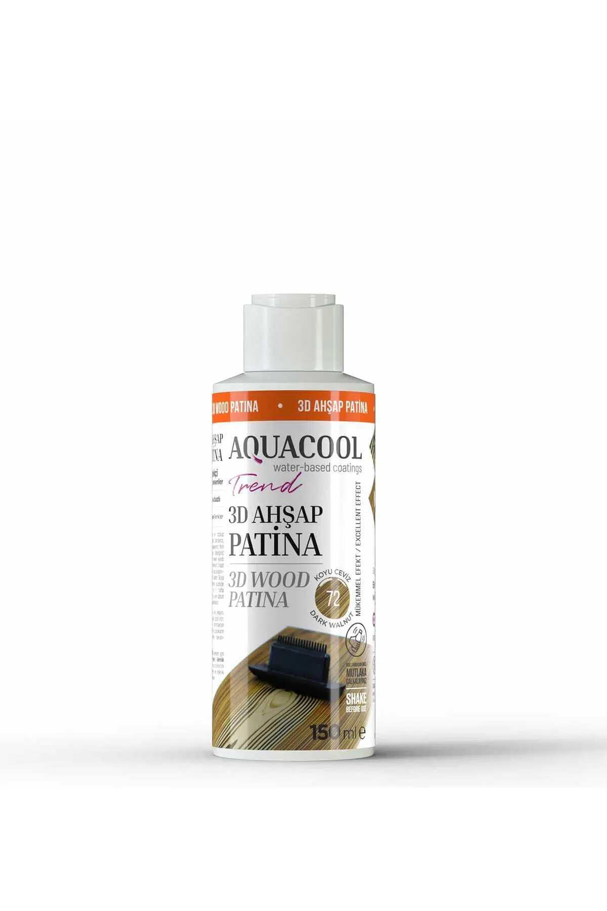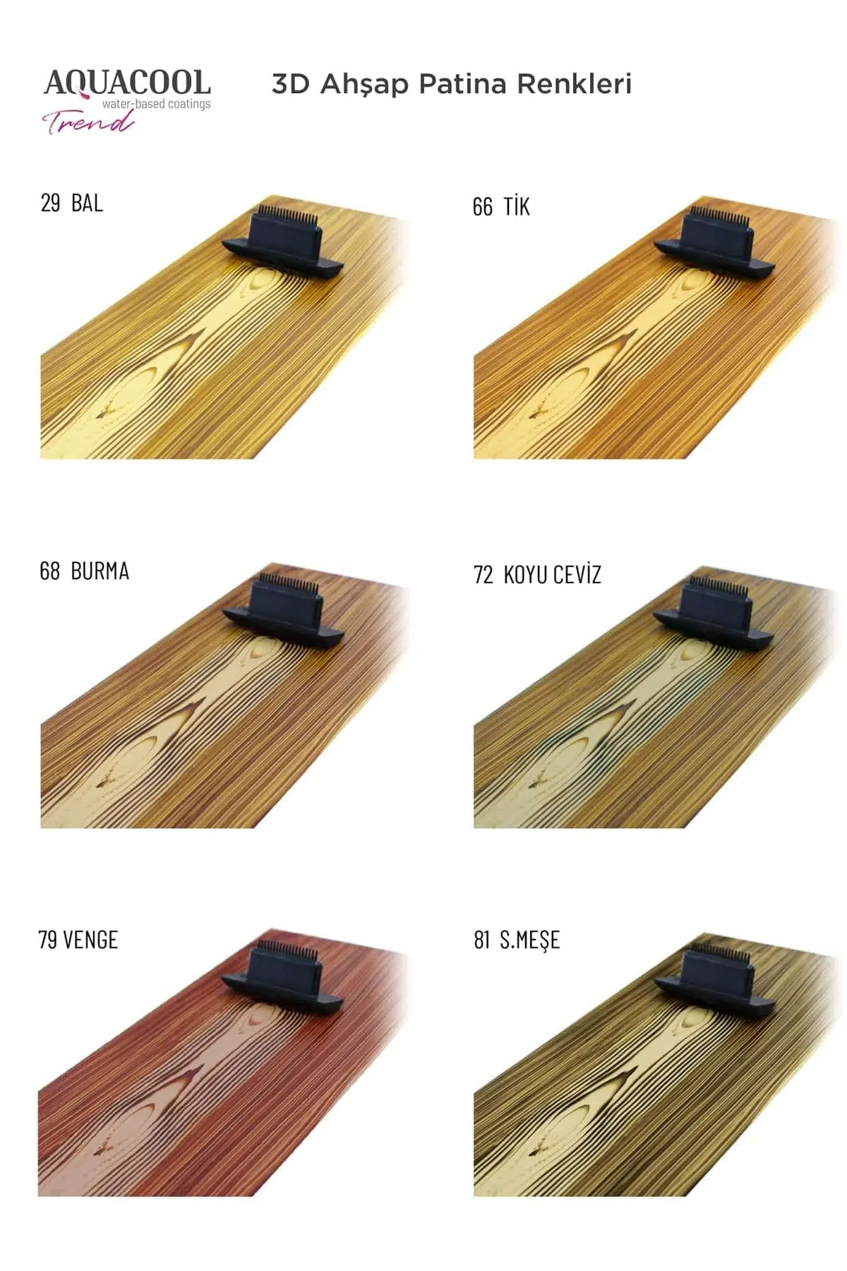 istediğiniz renkte Aquacool Trend boyamızı tüm yüzeye sürdükten sonra kurumasını bekleyip daha sonrasında Aquacool Trend 3d Ahşap Patina boyasını uygulayarak üzerinden budak tarağı ile geçebilirsiniz.