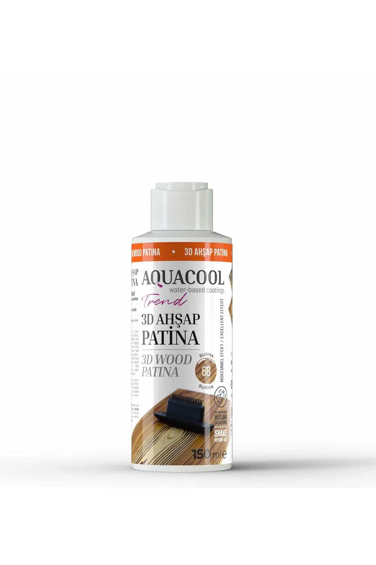 istediğiniz renkte Aquacool Trend boyamızı tüm yüzeye sürdükten sonra kurumasını bekleyip daha sonrasında Aquacool Trend 3d Ahşap Patina boyasını uygulayarak üzerinden budak tarağı ile geçebilirsiniz.