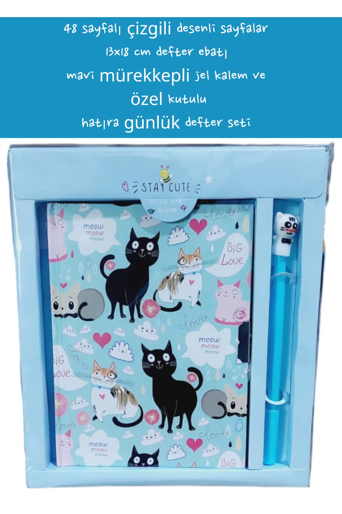 48 sayfalı çizgili desenli sayfalar 13x18 cm defter ebatı mavi mürekkepli jel kalem özel kutulu