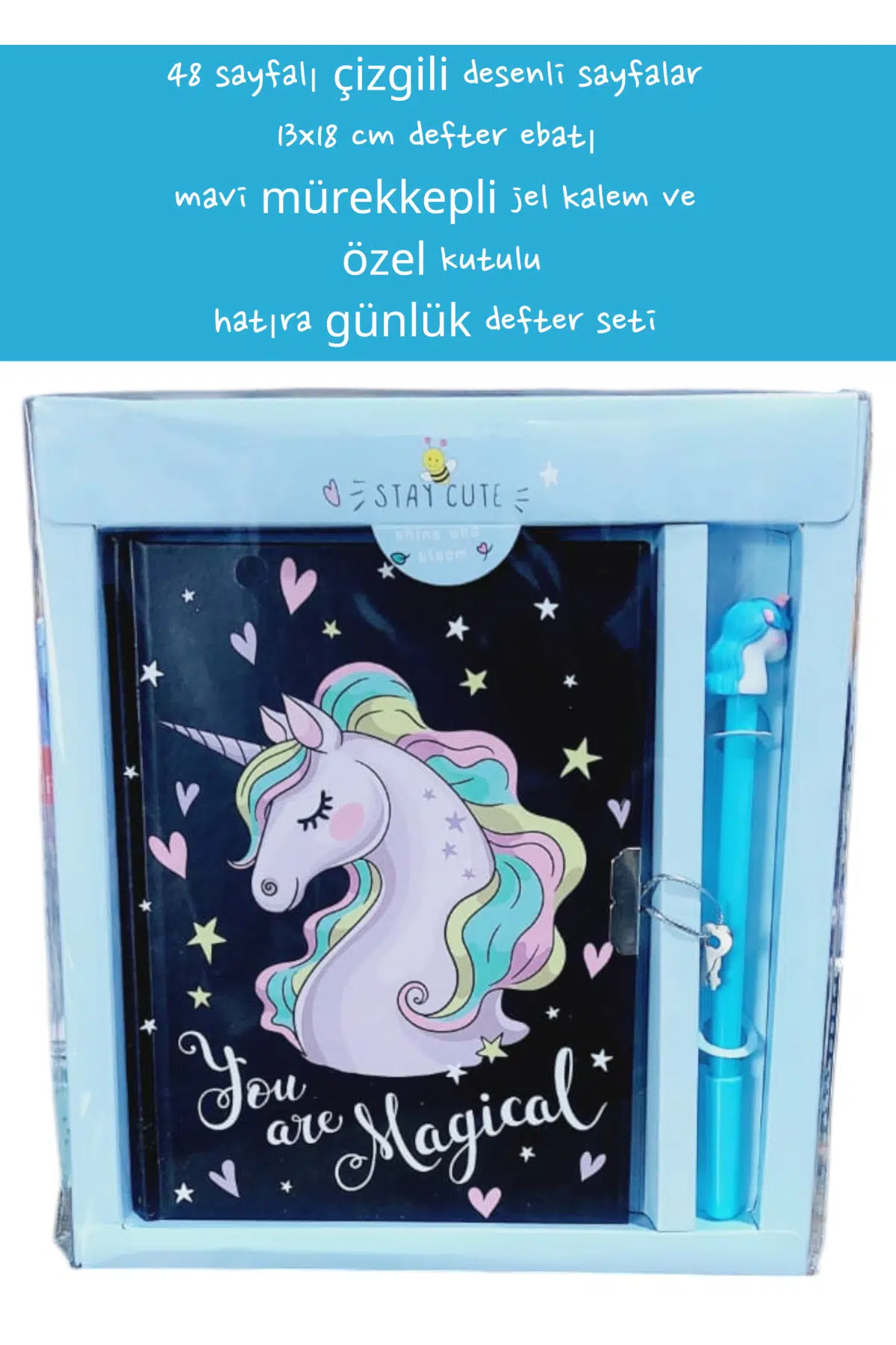 48 sayfalı çizgili desenli sayfalar 13x18 cm defter ebatı mavi mürekkepli jel kalem özel kutulu
