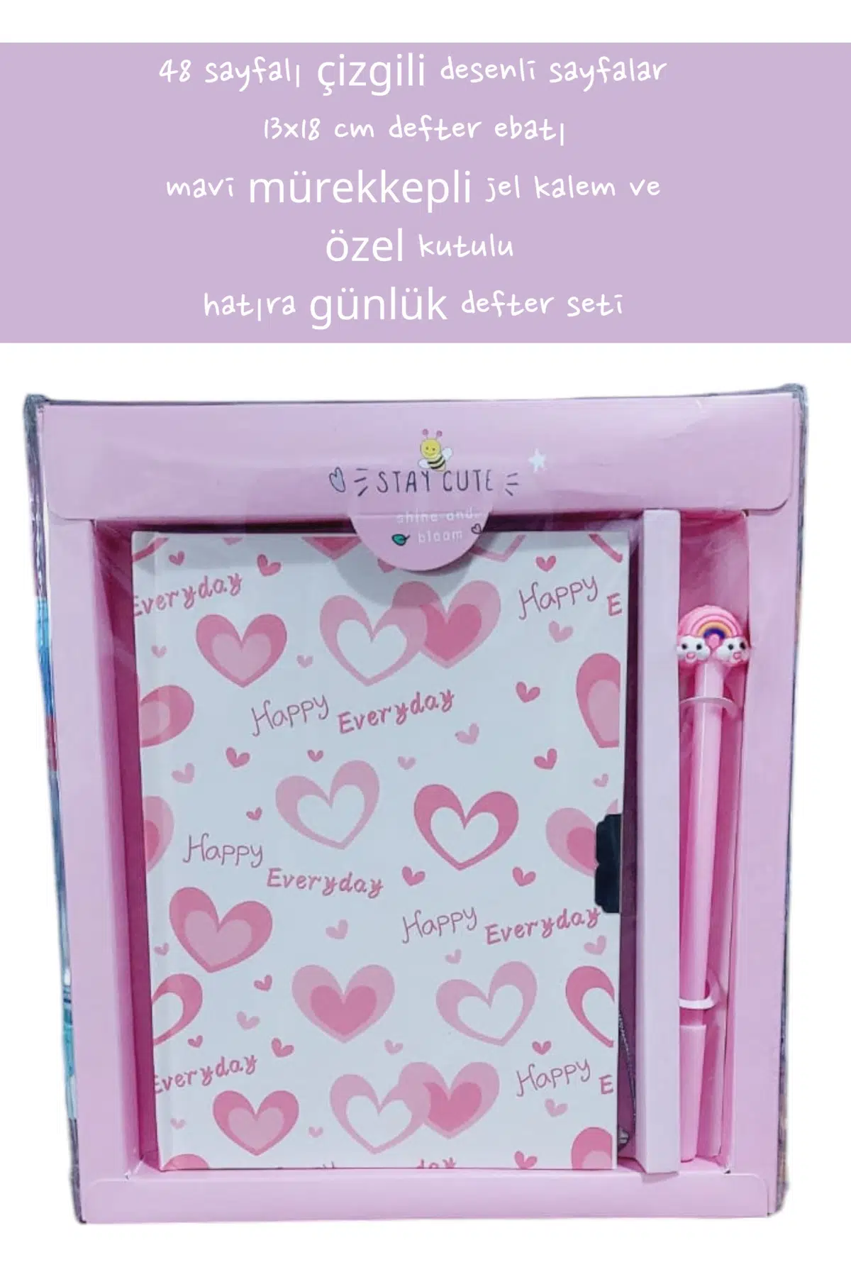 48 sayfalı çizgili desenli sayfalar 13x18 cm defter ebatı mavi mürekkepli jel kalem özel kutulu