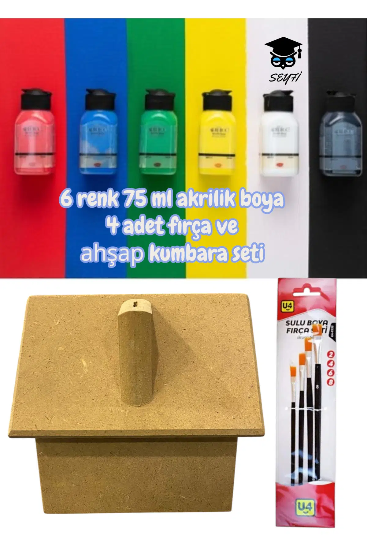 6 renk 75 ml akrilik boya 4 adet fırça ve ahşap kumbara seti KUMBARA EBATI 10X12X13 CM