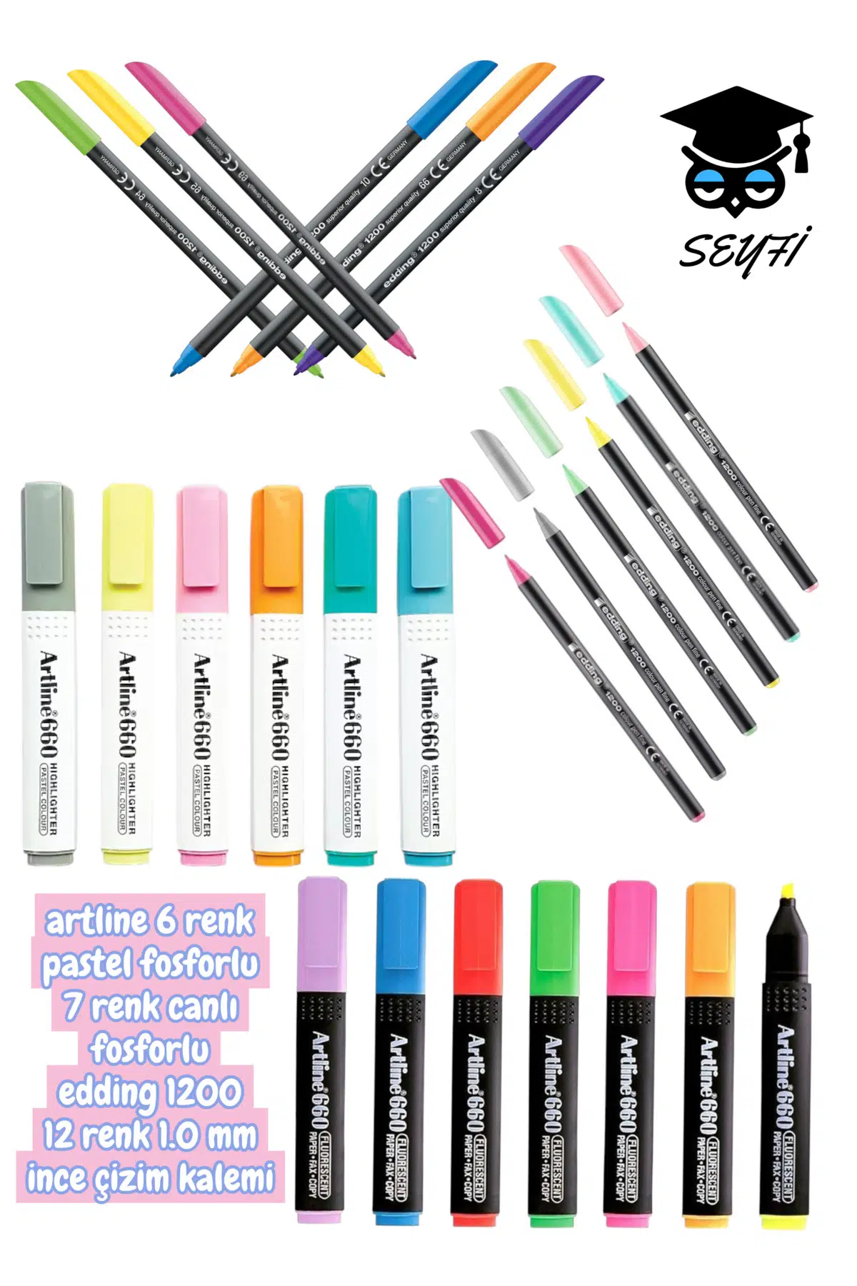 artline 6 renk pastel fosforlu 7 renk canlı fosforlu edding 1200 12 renk 1.0 mm ince çizim kalemi