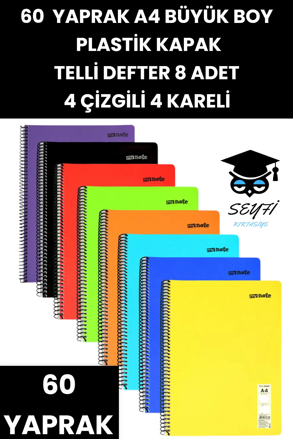 60 YAPRAK A4 TELLİ DEFTER 8 ADET 4 ÇİZGİLİ 4 KARELİ PLASTİK KAPAK