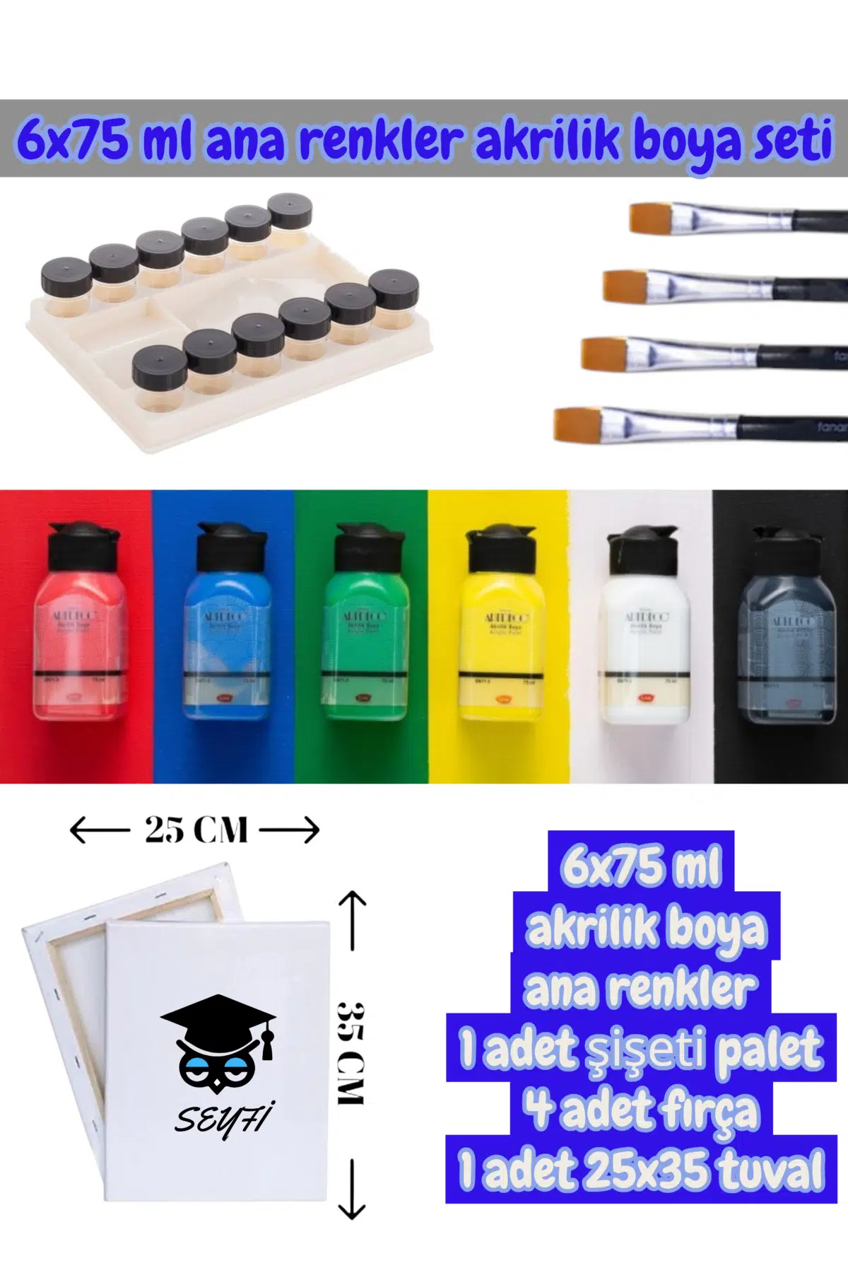 6x75 ml akrilik boya ana renkler 1 adet şişeti palet 4 adet fırça 1 adet 25x35 tuval