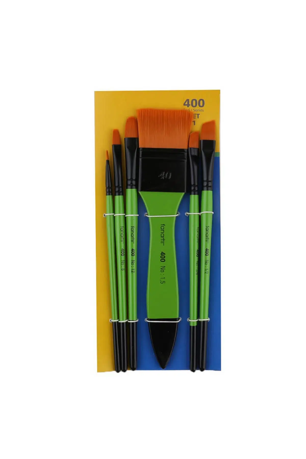 Fanart 6'lı karışık uçlu academy seri 400 no:1 fırça setimizin içerisinde; 1 adet 2 no kedi dili uçlu fırça,1 adet 8 no kedi dili uçlu fırça,1 adet 12 no kedi dili uçlu fırça,1 adet 3/8 no yan kesik uçlu fırça,1 adet 1/2 no yan kesik uçlu fırça,1 adet 1,5 no zemin fırçası bulunmaktadır. Hobi, sanatsal ve akademik boyama çalışmalarına uygun, dayanıklı sentetik kıl uçludur.