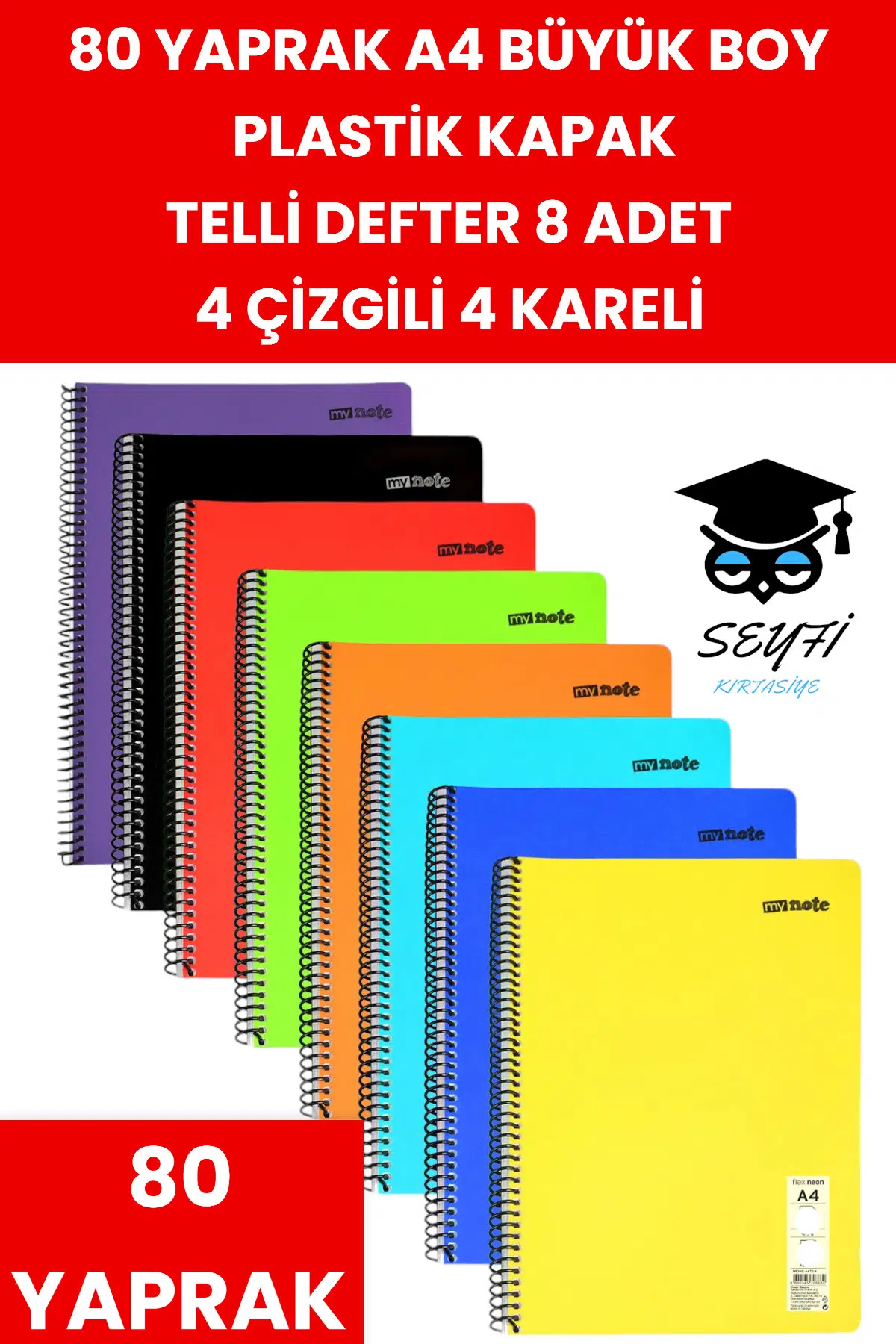 80 YAPRAK A4 TELLİ DEFTER 8 ADET 4 ÇİZGİLİ 4 KARELİ PLASTİK KAPAK