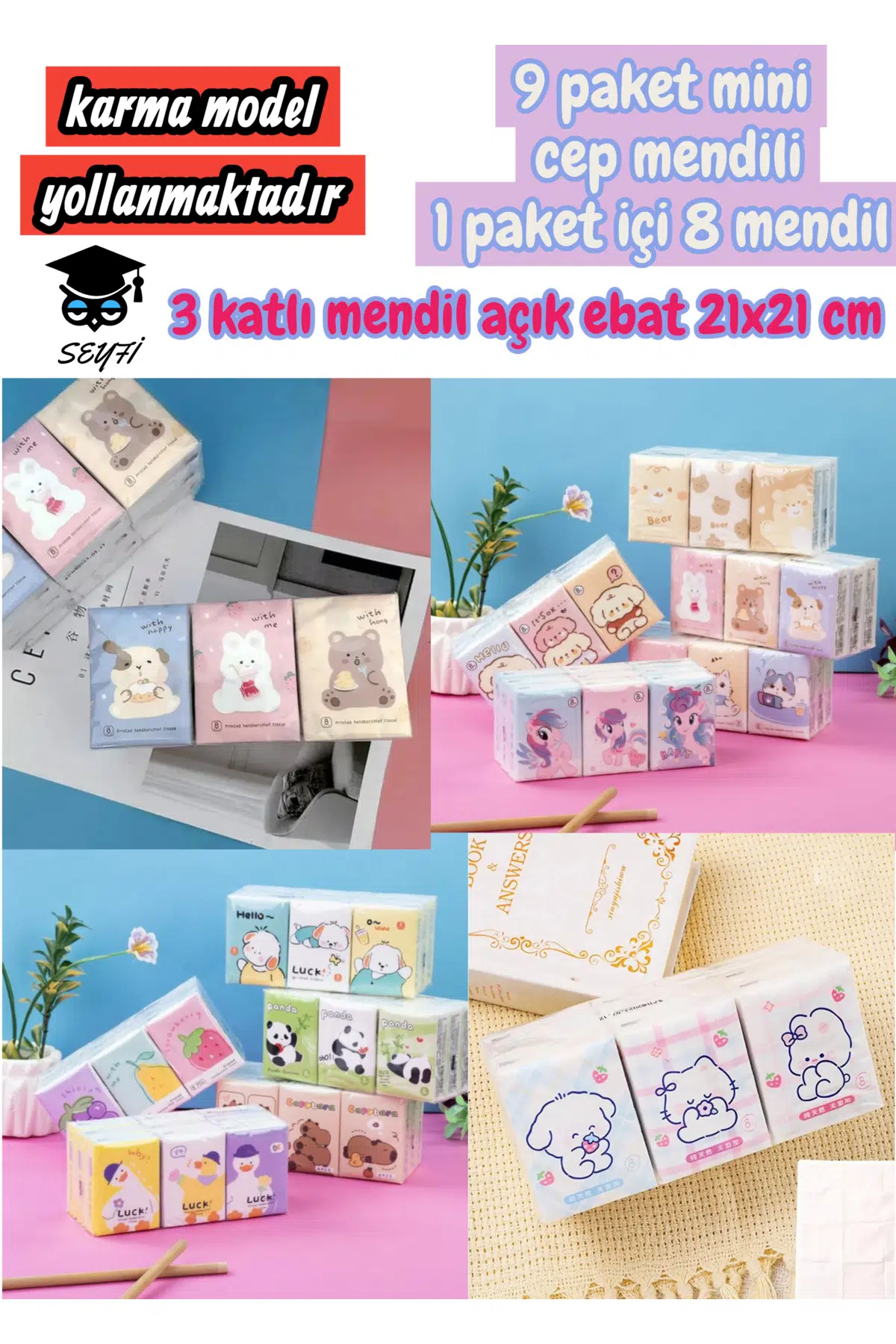 9 paket mini cep mendili 1 paket içi 8 mendil 3 katlı mendil açık ebat 21x21 cm karma model yollanmaktadır