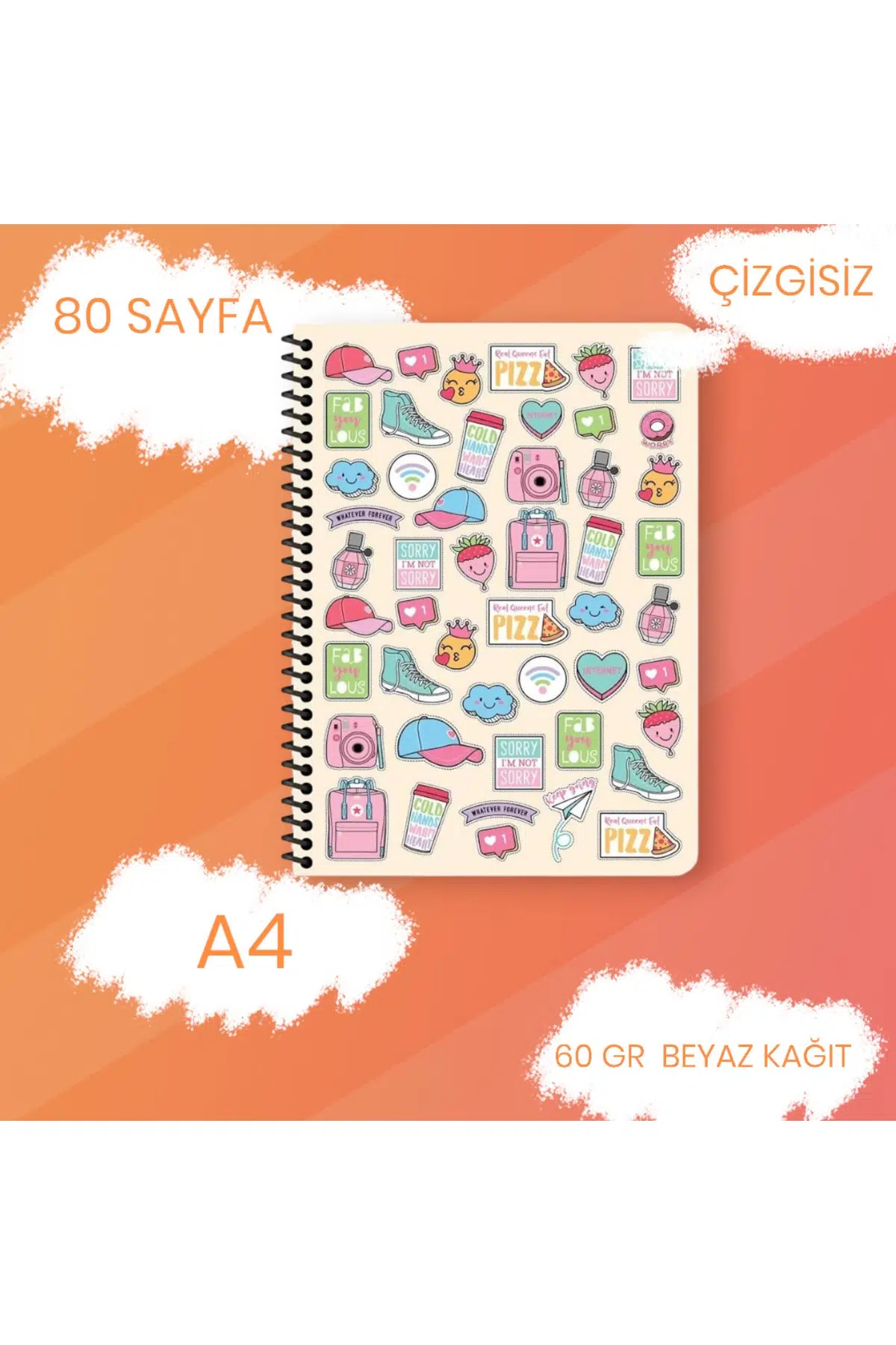 A4 ÇİZGİSİZ 80 SAYFA 60 GR BEYAZ KAĞIT PLASTİK KAPAK TELLİ DEFTER SWEET