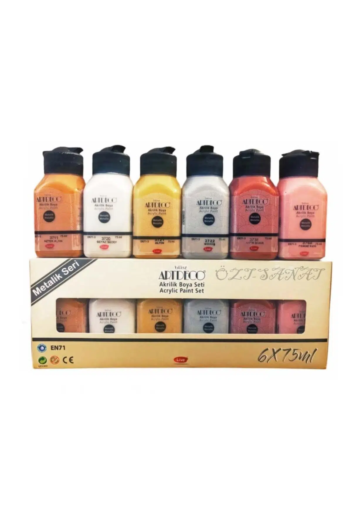 Artdeco Akrilik Boya 6x75 ml Metalik Renkler Ürün Görselleri Tedarikci ve ithalatcı firmamızdan Entegrasyon ile yüklendiği için Barkodlarından kaynaklı farklı resim olabilmektedir. ; Ürün isimlerine bakarak ürünleri satın alınız. ; Ürün görselleri yanıltıcı olabilmektedir. ; Ürün isimlerinde 10 ad. ; v.b. ; gibi belirtilmemişse ürünün 1 ad. ; fiyatıdır. ; Bazı ürünlerin görselleri İthalatçısı tarafından bütün renklerini göstermek amaçlı çoklu hazırlanmıştır.Bu gibi durumda ürün adında miktar belirtilmemişse stokta olan renklerinden 1 adet gönderilmektedir. ; Ürünlerimiz adet olarak satılmaktadır (Bazı ambalajlı ürünler hariç) , tereddüt ettiğiniz ürünler için "Soru Sor" bölümünden yada 08508408962 Whatsap Destek Hattımızdan bize yazabilirsiniz. ; Bazı ürünler asortidir ve stokta olan renkleri/modelleri gönderilmektedir. ; Model tercihi belirtmediyseniz ve yinede gelen ürünün modelini değiştirmek istiyorsanız gidiş-geliş kargo ücretinin tarafınızdan ödenmesi gerekmektedir. ; Kitaplarda güncel kapak ve güncel içerik takip edilmektedir, ürün görseli sizi yanıltmasın.Basım yılı eski bile olsa müfredat değişmediği için içeriği günceldir.Müfredat değiştiğinde yayınevlerine ilgili kitaplar iade edilmektedir. ; Siparişlerinizi 24 saat içerisinde kargoya teslim ediyoruz Fakat bazen Depodaki yoğunluğumuzdan yada Kargo şirketlerinden kaynaklı gecikmeler yaşıyoruz Acil olan siparişlerinizde mağazamıza ulaşarak bilgi verebilirsiniz.11:00’den önce verilen siparişleriniz ürün detayında belirtildiği gibi (aynı gün kargo, ertesi gün ,2-3 gün içinde kargo) işleme alınacaktır. ; 11:00’ dan sonra verilen siparişler ürün detayda yer alan kargo süresine göre işleme alınacaktır. ; Almış olduğunuz ürünler Mevzuat gereği iade şartlarını karşılaması halinde ambalajı ve orijinalliğinin bozulmamış olmaması kaydı ile 7 gün içerisinde iade alınabilmektedir. ; Sağlık, bakım ve Elektronik ürünleri bu kapsam içerisinde değildir.Kargo ücretleri Alıcı ya ait olup Mağazamızın onayı olmadan gönderilen kargolar tarafınıza tekrar iade olarak gönderilmekte ve tarafınıza çift yön kargo ücretleri yansıtılmaktadır.İade talebinizi mağazamıza 08508408962 whatsap destek hattımızdan ürünün resimleri ile beraber talepde bulunmanız gerekmektedir. ; Firmamızın pazarda bu kadar büyük bir paya sahip olmasının nedeni,kalitemizi kuruluşumuz olan 2007 yılından beri korumamızdır. ; Biz Nusrat Bilişim Kırtasiye Reklam ve Baskı Çözümleri olarak okul öncesi dönemin insan hayatında ne kadar önemli bir zaman dilimi olduğunun farkındayız. ; Çocuklarımız geleceğimizdir, okul öncesi dönem ise eğitimin temelidir. ; Bu sebeple her zaman işimizi büyük titizlikle yaptık. ; Tedarik ettiğimiz ürünlerimizin içeriğinde, hem de fiziksel özelliklerinde en kalitelisi ve en mükemmelini yaptık ve yapmaya da devam ediyoruz. ; Türkiye’de Nusrat Bilişim olarak sevgi ve güven duyulan bir firma olmakla gurur duyuyoruz. ; Hedefimiz bu çizgimizi ve prestijimizi güçlü kadromuz ve ürünlerimizle daima sürdürmektedir. ; Genç bir firma olmasına rağmen, ürün portföyünü sürekli geliştiriyor olması ve alanın ihtiyaçlarını göz önünde bulundurarak ürün çıkartıyor olması firmamızın, eğitimciler ve veliler tarafından beğenilmesini sağlamaktır.;