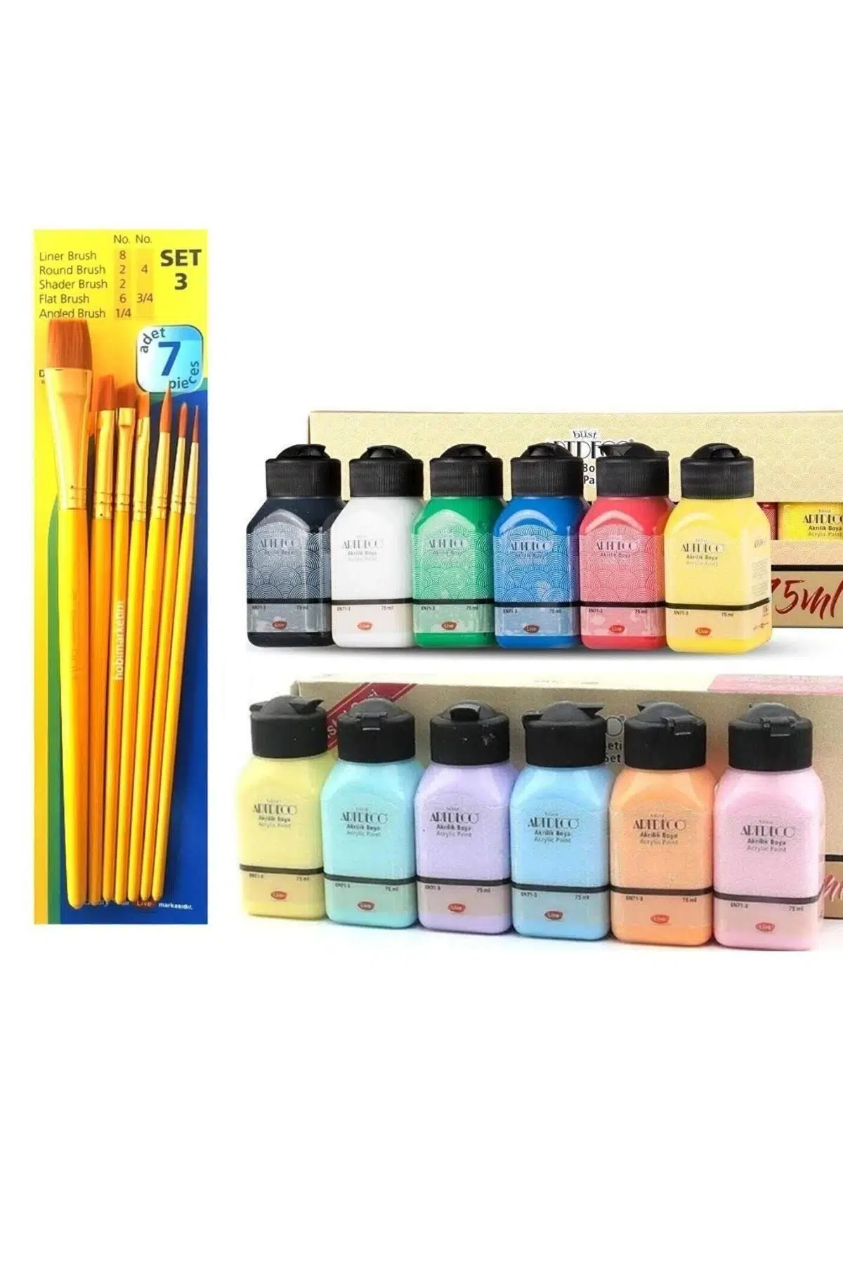 Set İçeriği: 1 adet Artdeco 6x75 ml Pastel Renkler Serisi + 1 adet Artdeco 6x75 ml Canlı Renkler Serisi + 1 adet Fanart no:3 7'li fırça.;