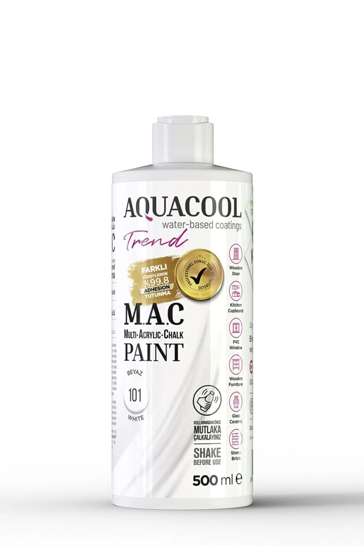 Aquacool Trend MAC Boya Nedir? Astar, zımpara ve vernik gerektirmeyen Aquacool Trend MAC Boya sayesinde artık evde renginden sıkıldığınız, eskidiğini düşündüğünüz her şeyi kırmadan ve dökmeden boyayarak yenileyebilirsiniz. ; Alanında ilk kez geliştirilen Aquacool Trend MAC Boya, piyasada bilinen geleneksel hobi boyalarından farklı olarak her türlü yüzeyde üstün tutunma gücüne sahip ve sektör profesyonelleri tarafından geliştirilen nanoteknolojik bir formüldür. ; Üstün reçine yapısı ile mobilya, kapı, PVC pencere, fayans gibi birçok yüzeyde evinizin kendi ustası olarak profesyonel kalitede yüzey oluşturabilirsiniz. ; Ürün Özellikleri Astar, zımpara veya vernik gerektirmez. ; Tamamen su bazlı ve kokusuzdur. ; EN71-3 sertifikalıdır, insana ve doğaya zararsızdır. ; Farklı yüzeylerde tutunma gücü yüksektir, darbelere ve çizilmeye karşı dayanıklıdır. ; Üstün örtücülüğe sahiptir. ; Leke ve kir tutma direnci yüksektir, sabunlu su ve mikro fiber bez ile kolaylıkla temizlenebilir. ; Boyalar kullanıma hazır hale gelir. ; Katlar arasında 2-3 saat beklemeniz gerekir. ; 150ml ortalama 1-1,5m2, 500ml ortalama 4-5m2, 1000ml ortalama 8-10m2 alan boyayabilir. ; Ambalajlar Lift & Peel folyolu özel kapak sistemine sahiptir. ; Kadife rulo ve fırça ile kolaylıkla uygulanır, rulo ya da fırça izi kalmaz. ; Ahşap ve MDF yüzeyler dışındaki yüzeyler için MAC Boyaya Aquacool Katalizör eklenmesi gerekir. ; Nerede Kullanılır? Ahşap Kapı/Panel Kapı Çelik Kapı Mutfak & Banyo Dolapları PVC Pencere Ahşap Mobilyalar Beyaz Eşyalar Fayans ve Kalebodur Masa, Sandalye, Dresuar, TV Ünitesi, Gardırop Cam ve Seramik Yüzeyler Taş-Tuğla Yüzeyler Metal Yüzeyler Beton Yüzeyler Merdiven Korkulukları Kalorifer Petekler;