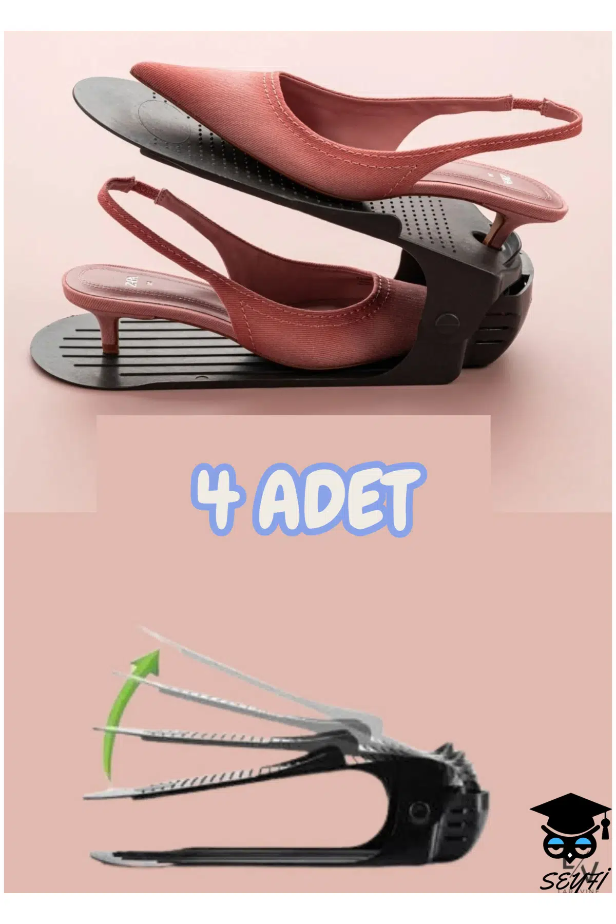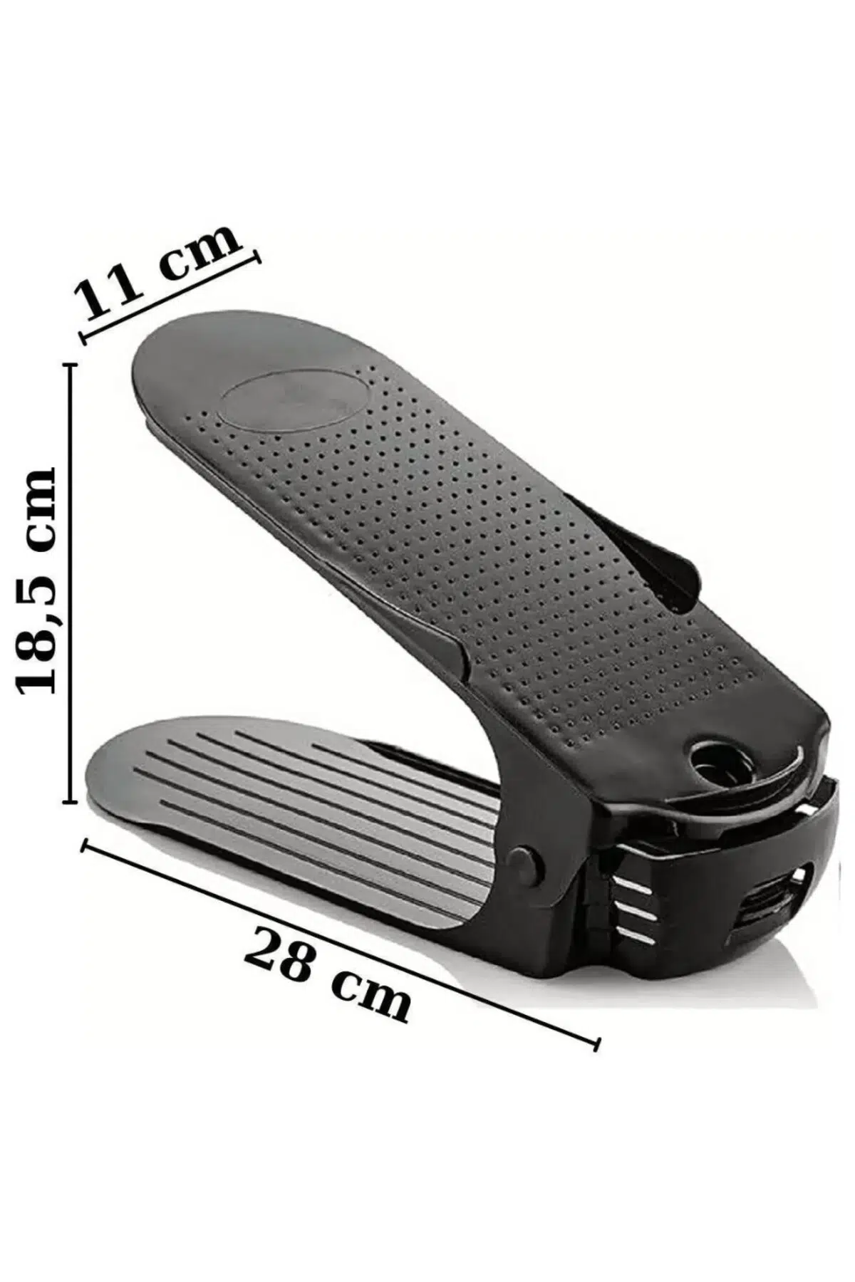 - Dayanıklı plastik malzemeden üretilmiş, uzun ömürlü kullanım sunar.; - 4 farklı ayarlama kademesi ile her türlü ayakkabı boyutuna uyum sağlar.; - Kolayca temizlenebilir yüzeyi sayesinde hijyenik bir kullanım imkanı tanır.; - Siyah renk seçeneğiyle şık ve modern bir görünüm sergiler.; - Türkiye'de üretilmiş olup yerel kaynaklı malzemelerle çevreye duyarlı bir tercih sunar.