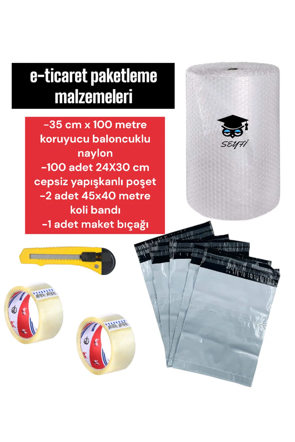 BALONCUKLU NAYLON POŞET CEPSİZ YAPIŞKANLI POŞET KOLİ BANDI MAKET BIÇAĞI TAM TAKIM PAKETLEME SETİ