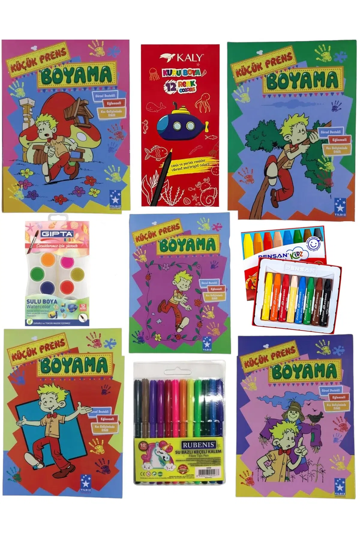 BOYAMA KİTABI SETİ BOYA SETİ 64 SAYFA ARKALI ÖNLÜ 128 SYF 5 ADET BOYAMA KURU; SULU; PASTEL; KEÇELİ BOYA 5 ADET 64 SAYFALI ARKALI ÖNLÜ 64 BOYAMALI KİTAP TOPLAM 640 ADET BOYAMA DESENİ MEVCUT DESENLER KIZ VE ERKEK ÇOCUKLARA UYGUN KARIŞIK DESENLERDİR 1 ADET 12Lİ jumbo SULU BOYA 1 ADET 12Lİ KURU BOYA 1 ADET 12 Lİ KEÇELİ BOYA 1 ADET 8 Lİ PASTEL BOYA;