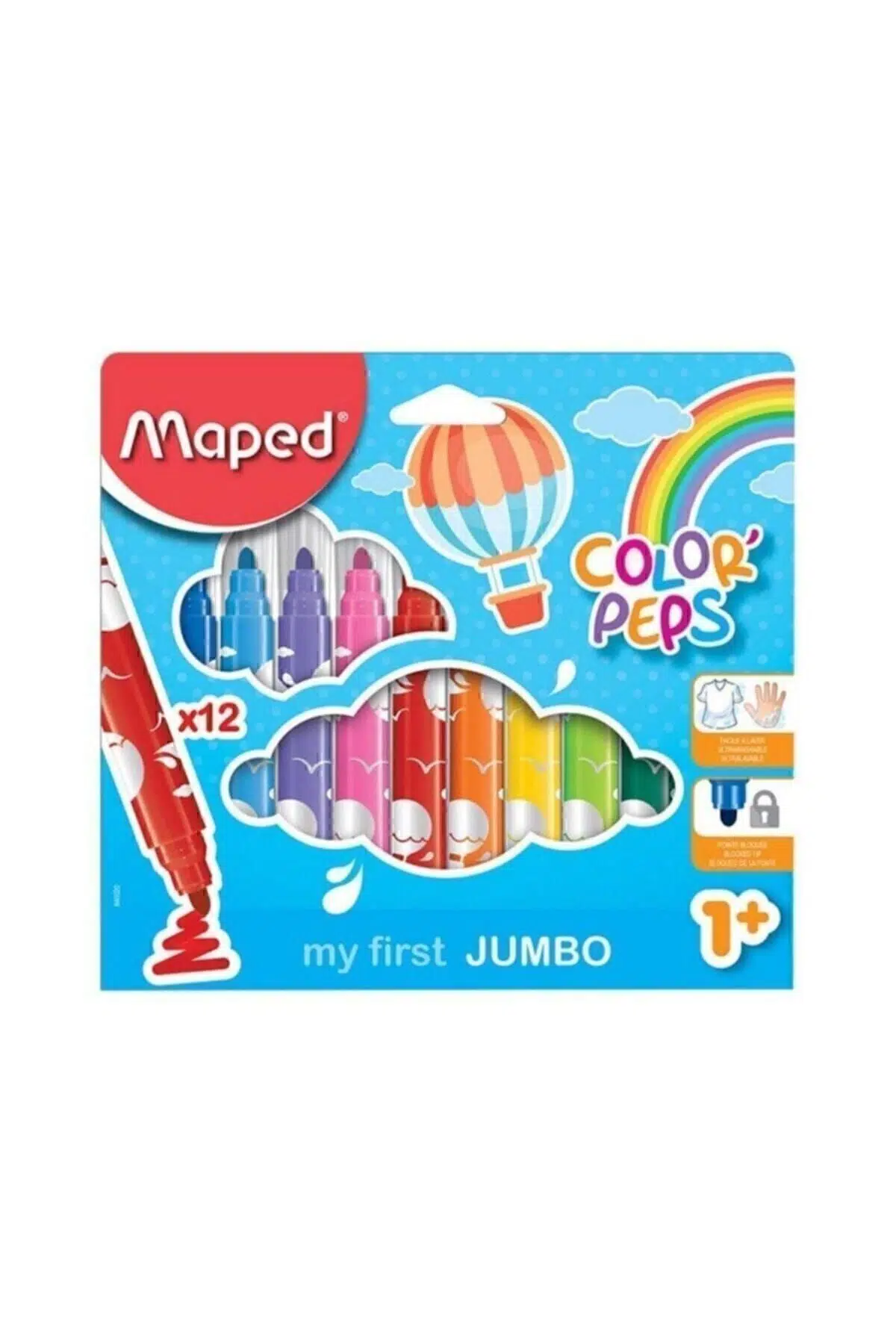 Maped Color Peps Jumbo Keçeli Kalem 12 Renk 846020 1 yaş ve üstü çocuklar için tasarlanmış keçeli kalemler • Güvenli uç: hem içeriye kaçma hem de dışarıya çıkma ihtimallerini engellemek için iki yöne doğru kilitlenmiştir; • Sabun ve suyla birçok kumaşta kolay yıkanabilir mürekkebe sahip • Küçük çocuklar için kolay tutum sağlayan materyal • Geniş, kilitli, konik uç: Ø 5 mm Barkodu : 3154148460206;