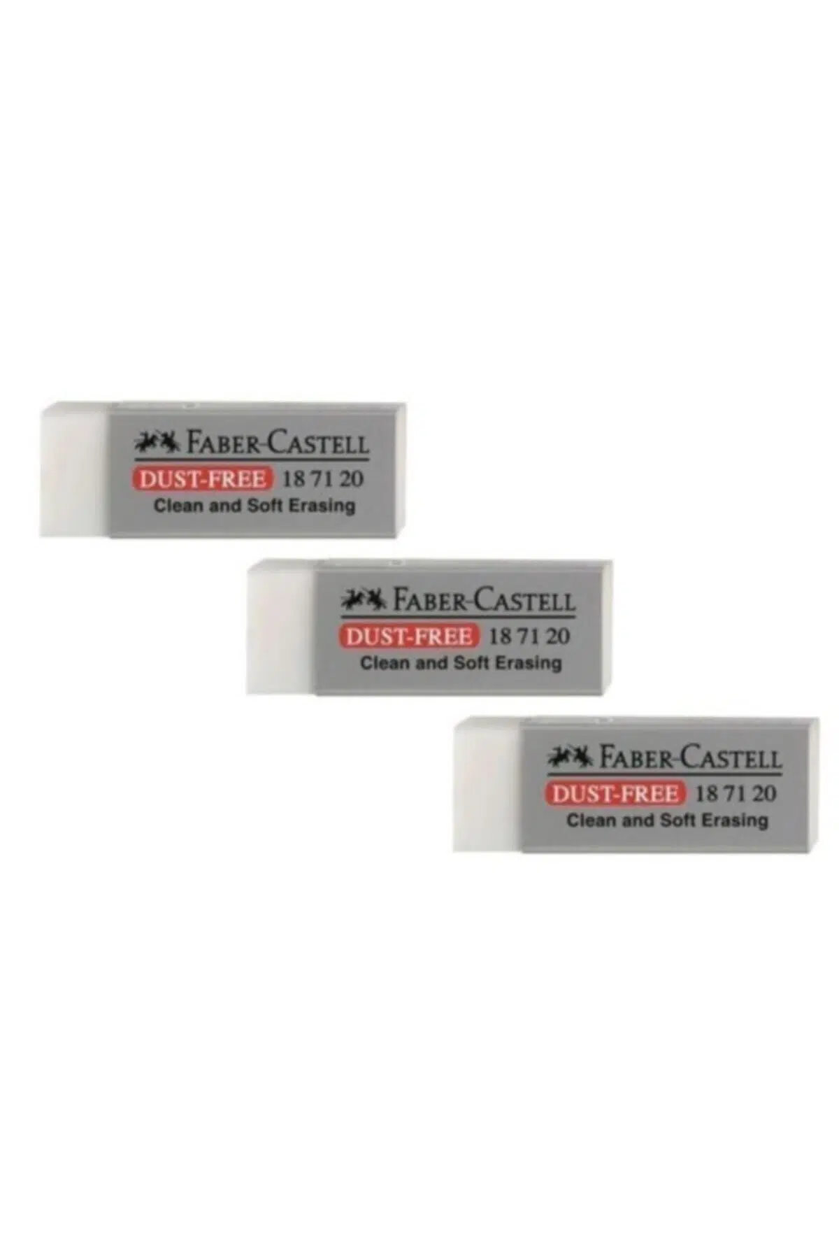 Faber Castell Dust Free Silgi No20 (3 Adet) -Faber Castell Beyaz Silgi Dust Free -Beyaz renk silgi -PVC içermez.; -Ergonomik tasarıma sahiptir.; -Kağıtta deformasyon oluşturmaz -Kurşun kalem izlerini silmek için idealdir.; -Silgi kullanıldığında artık toplanarak tek parça haline gelir, etrafa yayılmaz;