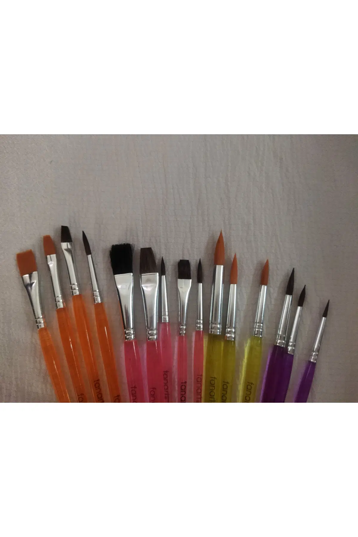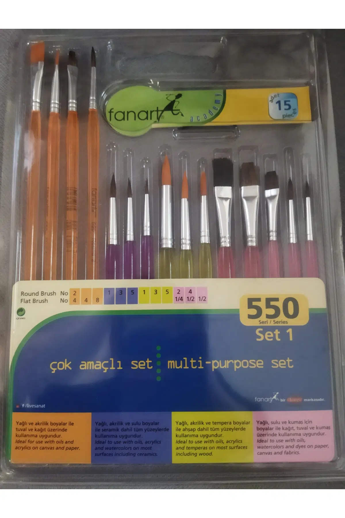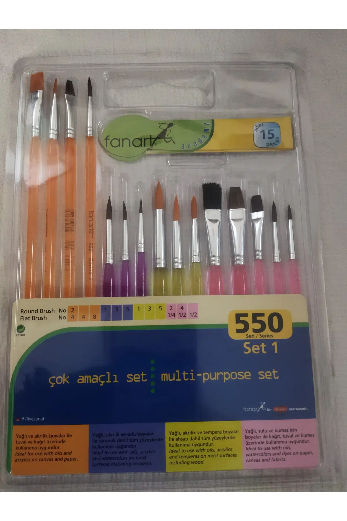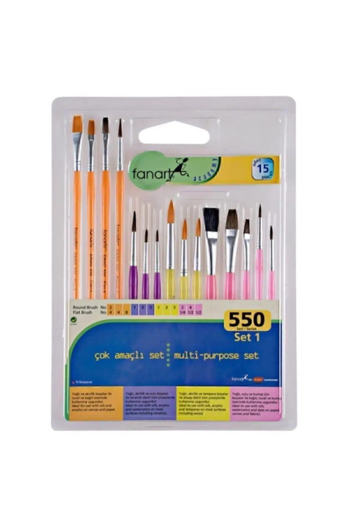 Yağlı ve akrilik boyalar ile tuval ve kağıt üzerinde kullanıma uygun, Fanart 550 seri 15 adet renkli saplı çok amaçlı fırça seti; Set içerisinde 9 adet yuvarlak uçlu, 6 adet düz uçlu fırça bulunmaktadır;