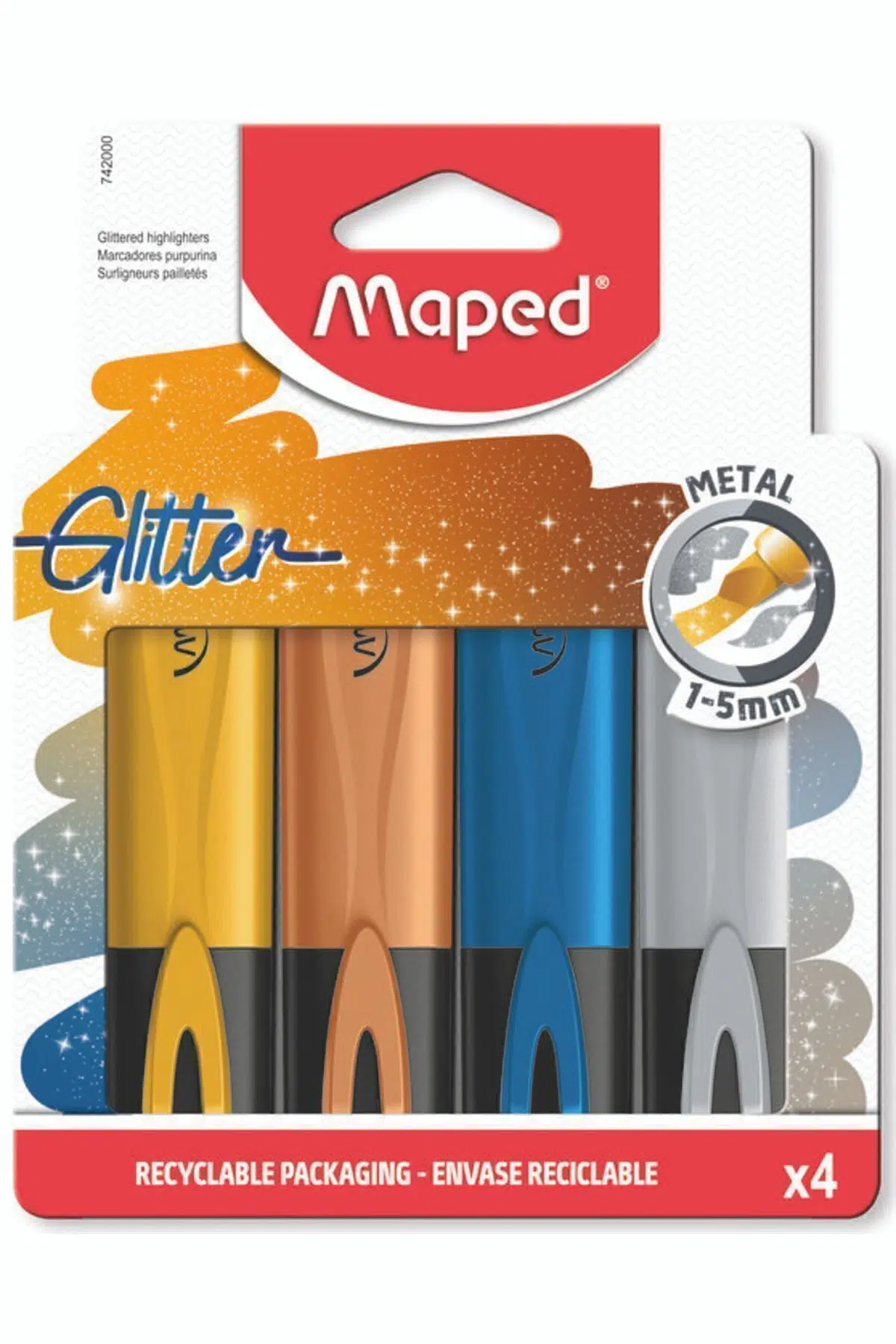 Maped Glitter Metal Kesik Uçlu Fosforlu Kalem 1-5mm - 4 Renk Defterlerinizi ve günlüklerinizi öne çıkarmak için 4 güzel parlak metal renk paketi. ; Metalik ton 1 ila 5 mm yazan eğimli uçlu ekstra pürüzsüz. ; Yumuşak keçe uç. ; Düzgün bir çizgi için tutarlı mürekkep dağıtımı. ; Mürekkebin kurumaması ve her tür kağıtta kullanılabilmesi için uzun kapatma süresi.;