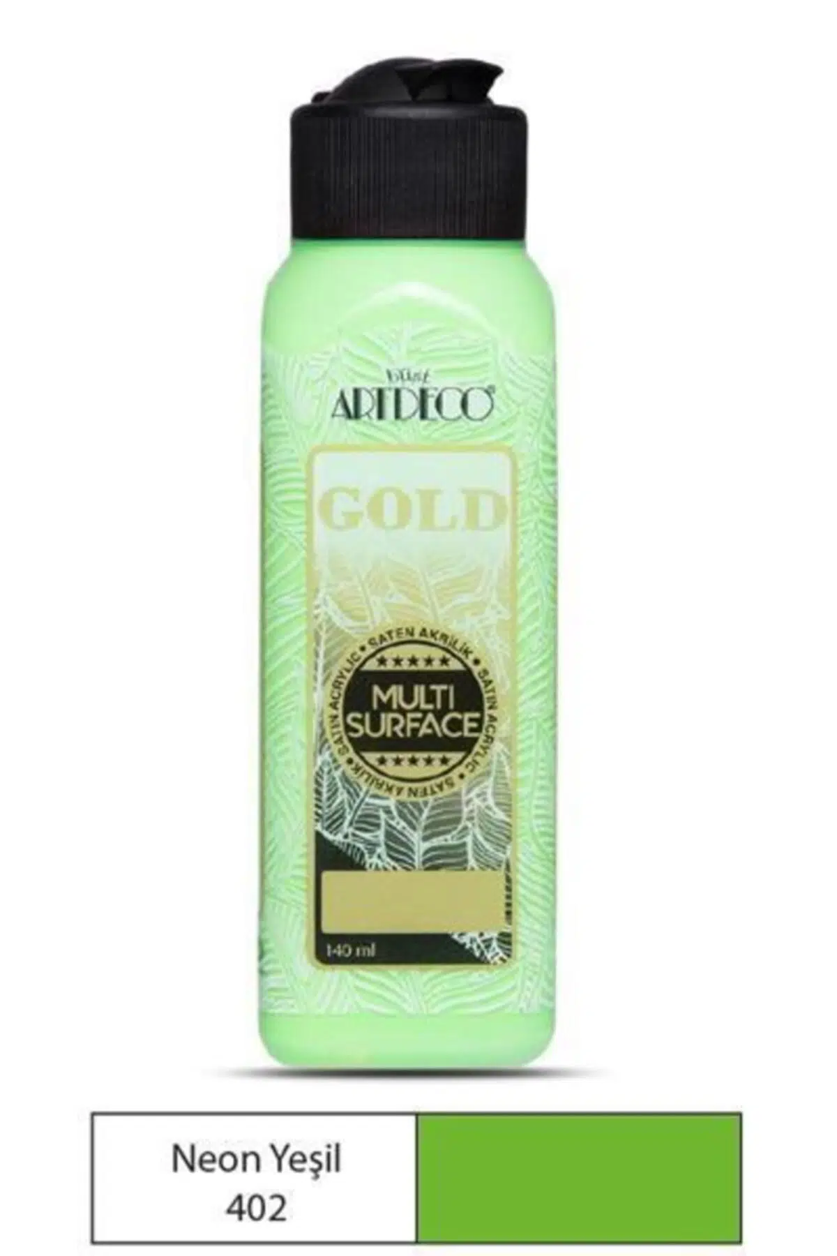 Artdeco Gold Multi Surface Akrilik Boya 140 ml. 402 NEON YEŞİL;Tüm yüzeylerde kullanılmak için özel olarak formüle edilmiştir.;Su bazlı, kullanıma hazırdır.;Ahşap, cam, seramik, porselen, kumaş, polyester, deri, kumaş, plastik, metal, duvar, strafor, tuval ve kağıt gibi yüzelerde kullanılabilir.;Uygulanan yüzeylerde satensi, kusursuz örtücülük sağlar.;Astar veya zımpara gerektirmez.;Bulaşık makinasında yıkamak için 21 gün beklemeniz ve çamaşır makinasında yıkamak için ütü ile fikse edilmelidir.;Parlak yüzeylerde ikinci kat uygulama için 12 saat bekletilmesi gerekir.;Sağlığa zararlı madde içermez.
