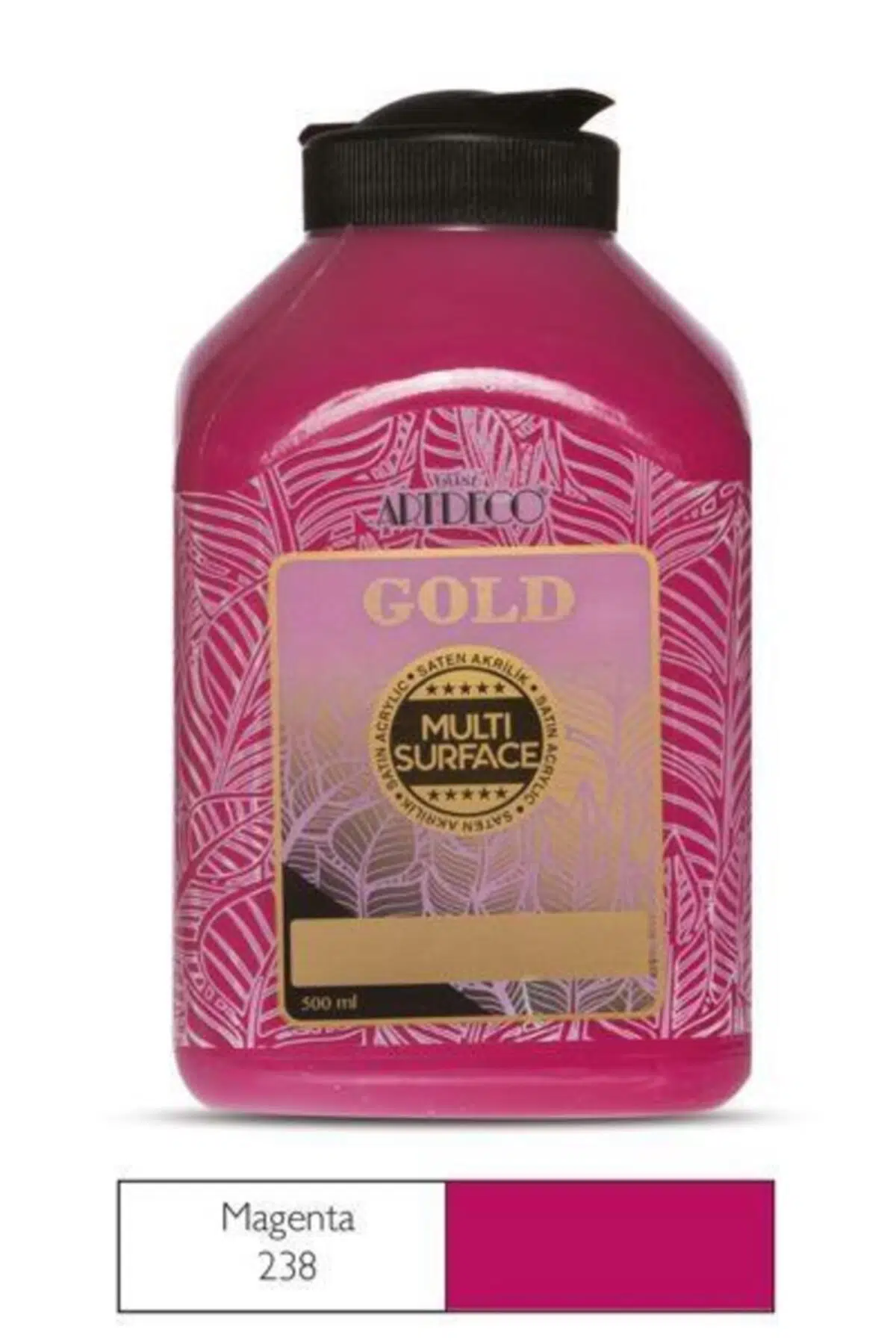 Artdeco Gold Multi Surface Akrilik Boya 500 ml. 238 MAGENTA;Tüm yüzeylerde kullanılmak için özel olarak formüle edilmiştir.;Su bazlı, kullanıma hazırdır.;Ahşap, cam, seramik, porselen, kumaş, polyester, deri, kumaş, plastik, metal, duvar, strafor, tuval ve kağıt gibi yüzelerde kullanılabilir.;Uygulanan yüzeylerde satensi, kusursuz örtücülük sağlar.;Astar veya zımpara gerektirmez.;Bulaşık makinasında yıkamak için 21 gün beklemeniz ve çamaşır makinasında yıkamak için ütü ile fikse edilmelidir.;Parlak yüzeylerde ikinci kat uygulama için 12 saat bekletilmesi gerekir.;Sağlığa zararlı madde içermez.