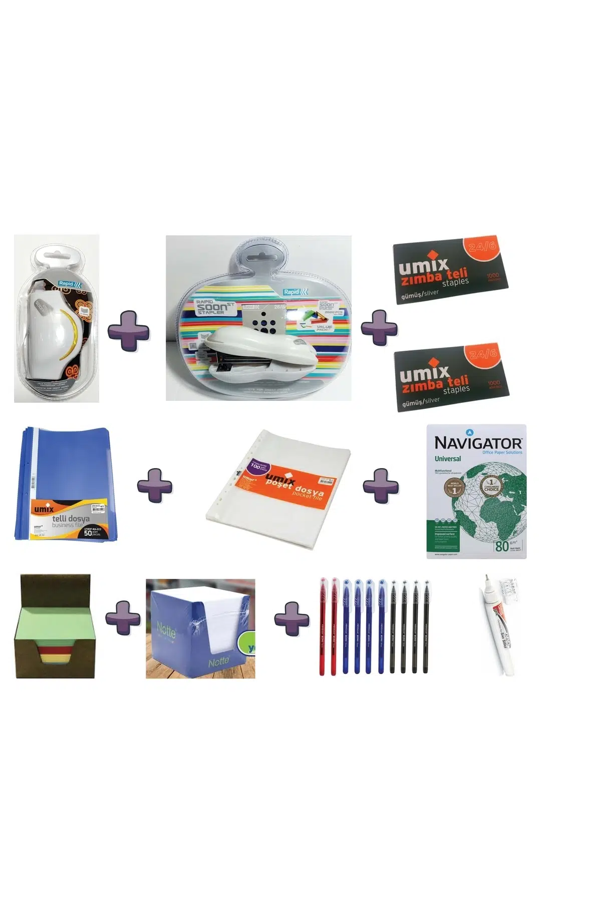 KAPSAMLI OFİS SETİ ZIMBA DELGEÇ FOTOKOPİ KAĞIDI VE BİR ÇOK ÜRÜN 1 ADET RAPİD ZIMBA VE DELGEÇ 2 ADET ZIMBA TELİ NO 24 50 ADET TELLİ DOSYA UMİX 100 ADET POŞET DOSYA UMİX 1 ADET 500 LÜ NAVİGATÖR KAĞIT 1 PAKET RENKLİ 1 PAKET BEYAZ KÜPNOT 10 ADET PENSAN BÜRO KALEM 1 ADET CASSA KALEM DAKSİL;