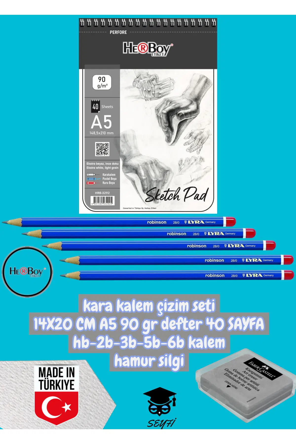kara kalem çizim seti 14X20 CM A5 90 gr defter 40 SAYFA hb-2b-3b-5b-6b kalem hamur silgi