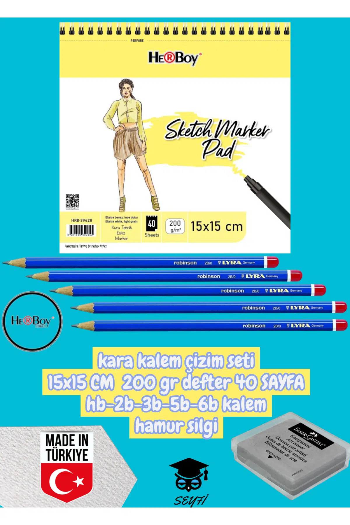 kara kalem çizim seti 15x15 CM 200 gr defter 40 SAYFA hb-2b-3b-5b-6b kalem hamur silgi