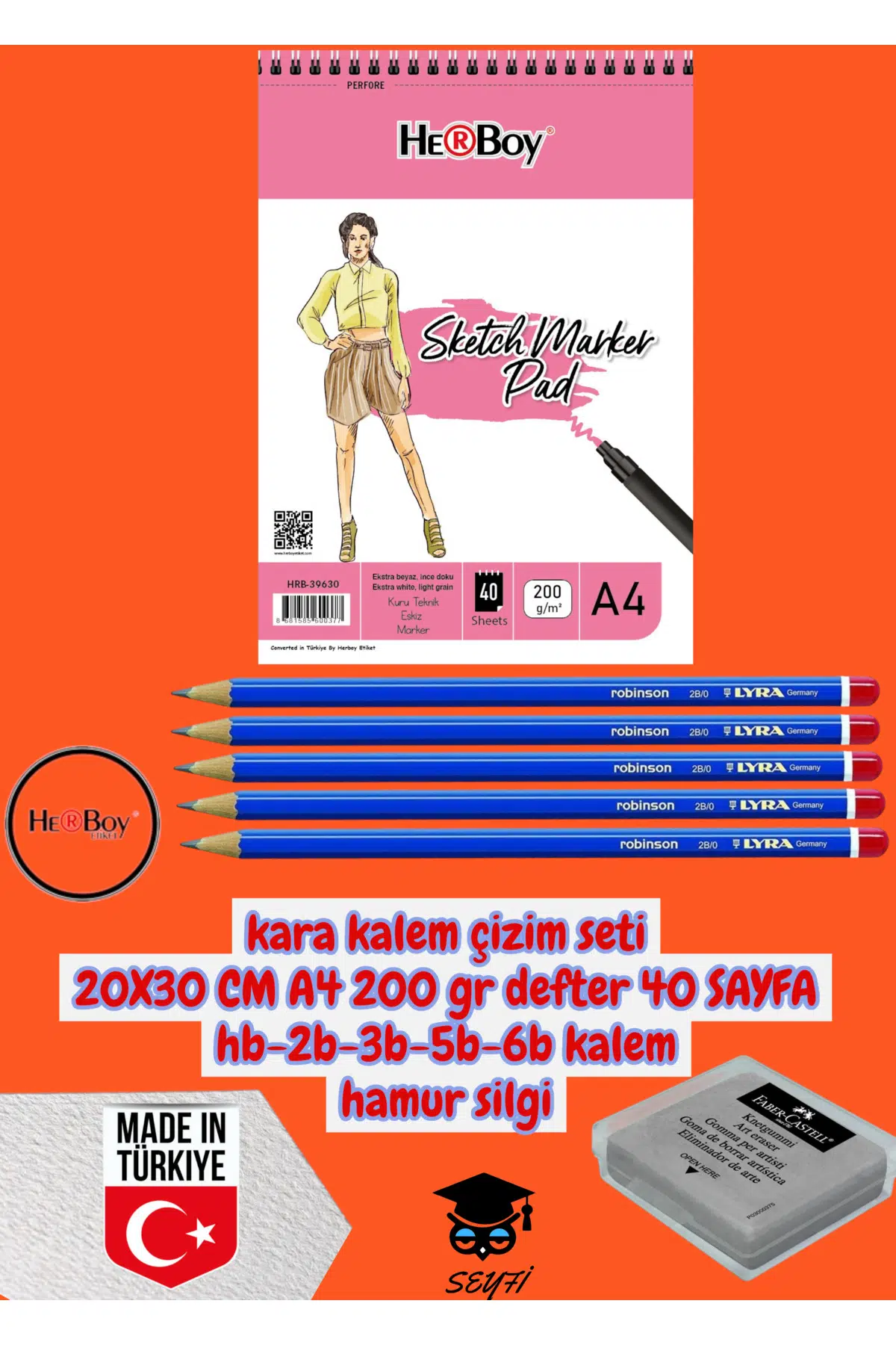 kara kalem çizim seti 20X30 CM A4 200 gr defter 40 SAYFA hb-2b-3b-5b-6b kalem hamur silgi