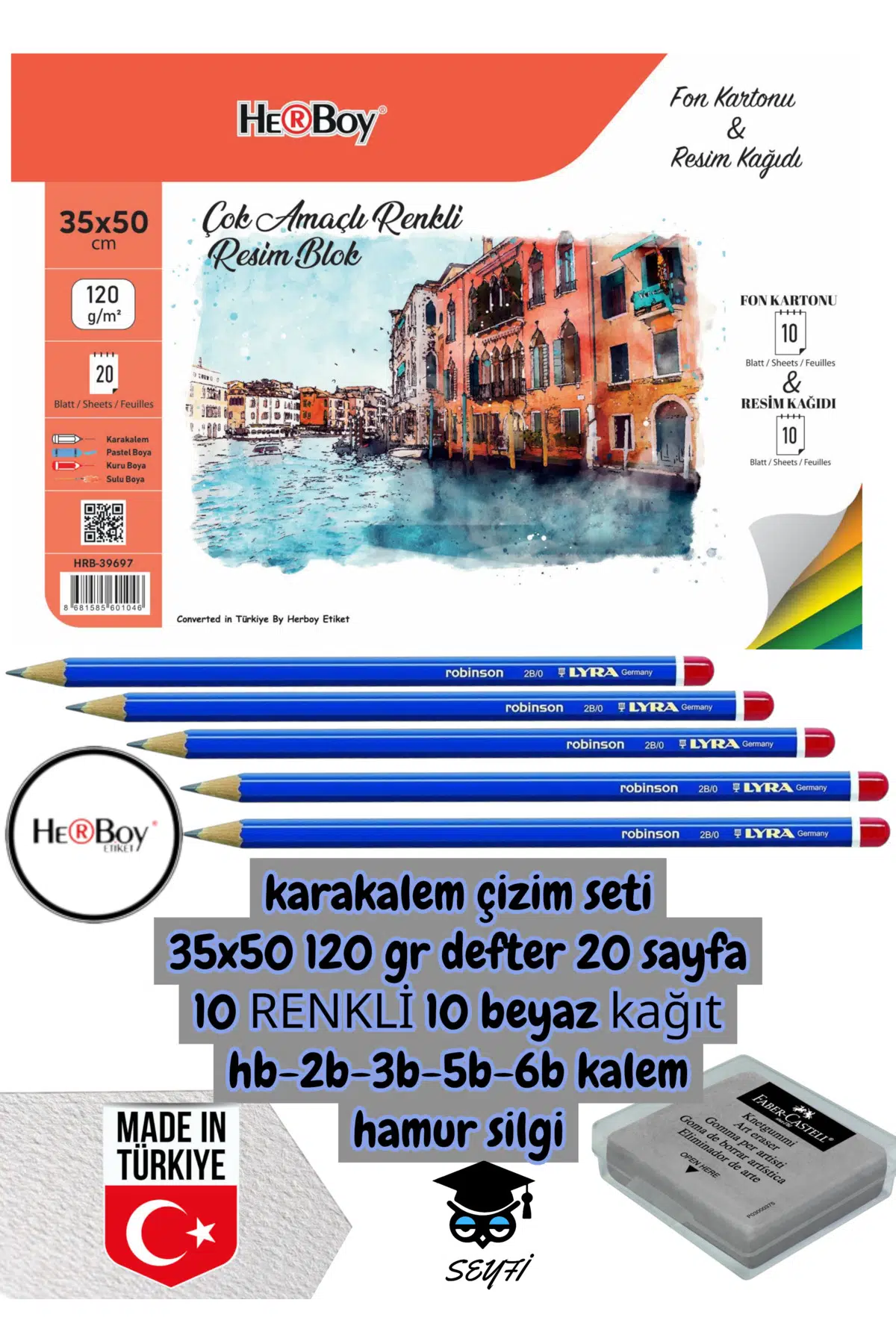 karakalem çizim seti 35x50 120 gr defter 20 sayfa 10 RENKLİ 10 beyaz kağıt hb-2b-3b-5b-6b kalem silgi