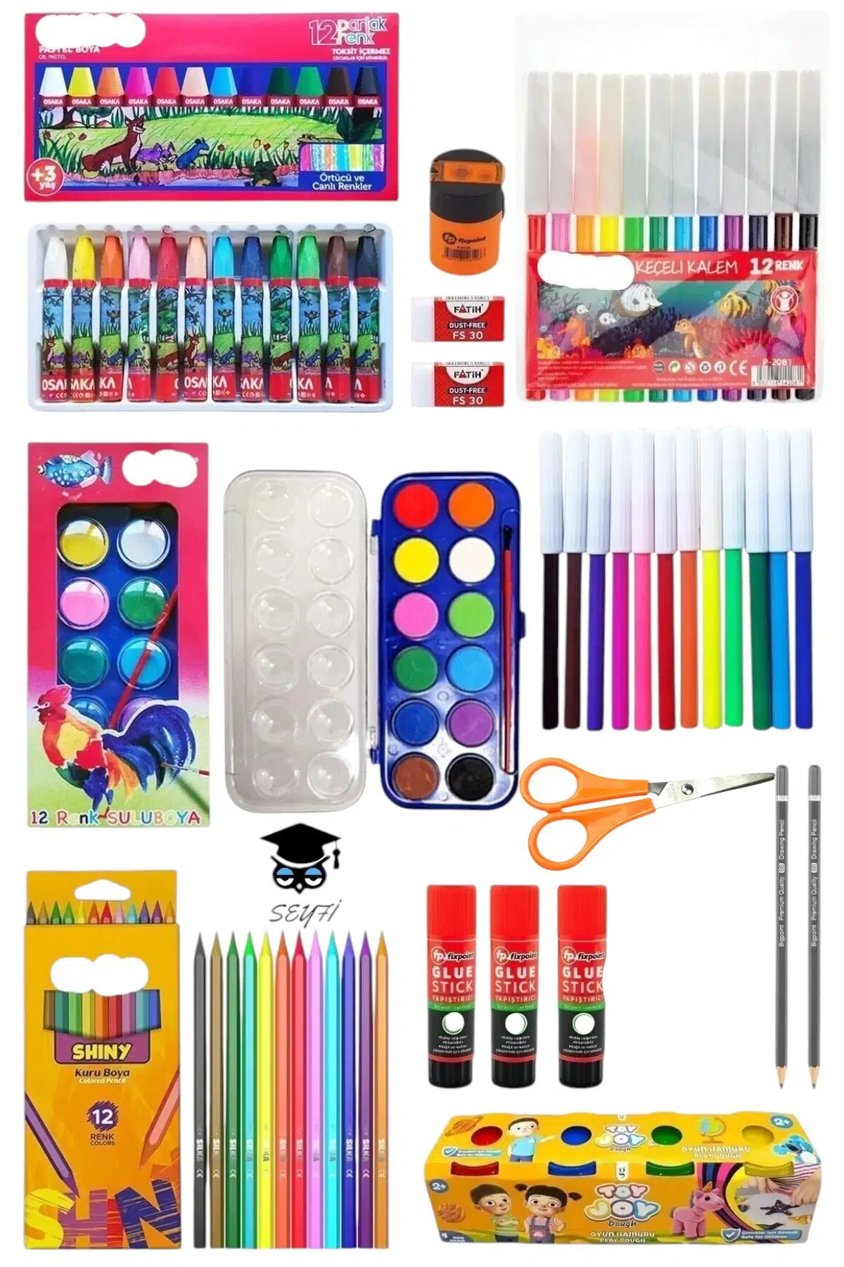 Ürün İçeriği : ; 1 Adet - Pastel Boya Seti 12’li ; 1 Adet - Sulu Boya Seti 12’li ; 1 Adet - Keçeli Kalem 12’li ; 1 Adet - Kuru Boya Seti 12’li ; 1 Adet - Oyun Hamuru 4RENK ; 3 Adet - Stick Yapıştırıcı 21 g ; ; 2 Adet - Dereceli Kalem 6B ; 1 Adet - Yaylı Okul Makası ; 2 Adet - Beyaz Silgi ; 1 Adet - Çift Hazneli Kalemtıraş ;