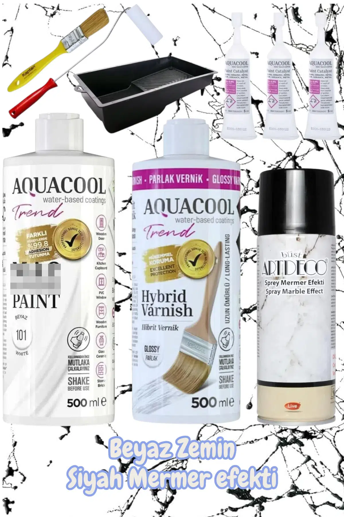 mermer fayans ıslak zemin lavabo boyama seti Beyaz Zemin Mermer efekti 500 ml vernik ve boya içerik: 1 adet 500 ml boya 1 adet 500 ml suya dayanıklı vernik 1 adet mermer efekti 1 adet boya tavası 1 adet rulo fırça 1 adet zemin fırça 3 adet 5 ml katalizör