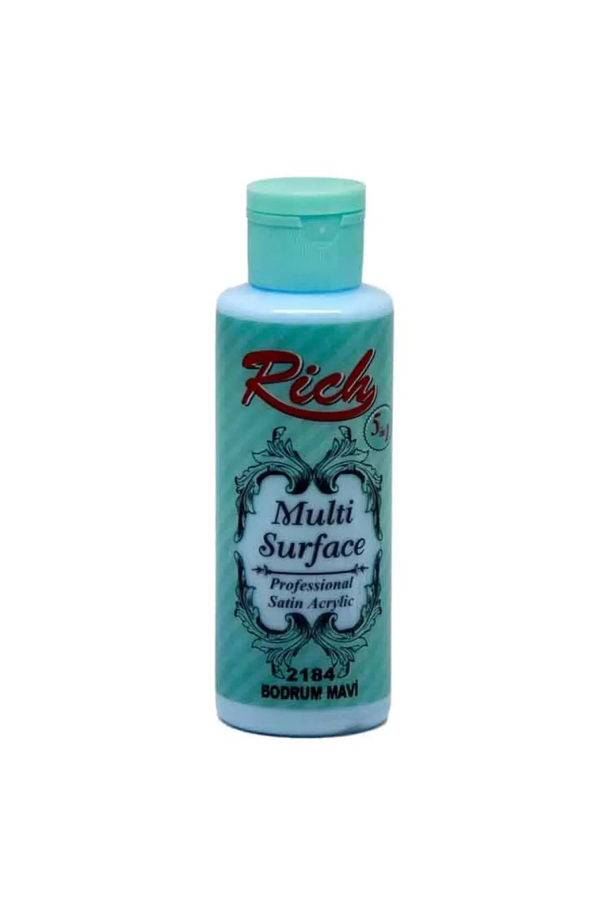 Rich Multi Surface 120 cc Bodrum Mavi 2184 Akrilik Boya Her yüzeyde kullanabileceğiniz Rich multi surface boyalar, hobi meraklılarının sıklıkla kullandığı bir üründür.; En kullanışlı Rich multi surface boyaya ulaşabileceğiniz internet sitemiz, çeşitli renk kataloğu ile siz değerli müşterilerimizin beğenisine sunuluyor.; Metal boyama, plastik boyama, ahşap boyama, kanvas boyama, seramik boyama, cam boyama, lake ve diğer birçok zeminde kullanılabilen Rich multi surface boya kataloğuna Bidoluhobi’den ulaşabilirsiniz.; En renkli tasarımlarınızı oluşturabileceğiniz Rich multi surface boyanın renk kartelası da oldukça zengin.; Dilediğiniz rengi mağazamızdan seçebilir ve tasarımlarınızı renklendirmenin keyfini çıkarabilirsiniz.; Tasarım yapanların ve el emeği ile figürler üretenlerin en önemli sorunlarından birisi olan renklendirme sorununun çözümü Rich multi surface boyalar ile çözülüyor.; Akmayan, kolayca kavlamayan ve kolay kullanımı ile boyama işlemini eziyet haline getirmeyen bu boyaya, Bidoluhobi portföyünden rahatça erişebilir ve güvenle sipariş verebilirsiniz.; Birçok yüzeyde kullanılabilen en kullanışlı Rich multisurface boya ile tasarımlarınızı renklendirebilir ve rahatlıkla sürebilirsiniz.; Hobicilerin en çok kullandığı ürünlerden birisi olan Rich multisurface boyalar, kolay kullanımı ile son zamanlarda çok revaçta olan bir ürün.; Hem Rich Multi Surface renk çeşitleri'ne hem de renk kartelasına göz atarak dilediğiniz rengi seçebilir ve politikamızdan faydalanarak en ucuz Rich Multi Surface boya sahip olabilirsiniz.; 120cc Rich multi surface boya ile yaklaşık 1-1.5 metrekare alan boyayabilir ve istediğiniz her yüzeyi renklendirebilirsiniz.; Multi Surface Boya Nasıl Uygulanır? Su bazlı multi surface boya metal, plastik, ahşap, kanvas, seramik, cam yüzeylere ince bir fırça yardımı ile direkt olarak uygulanabilir.; Siparişleriniz bidoluhobi tarafından özenle hazırlanır ve en kısa sürede ilgili kargo firmasına teslim edilir.