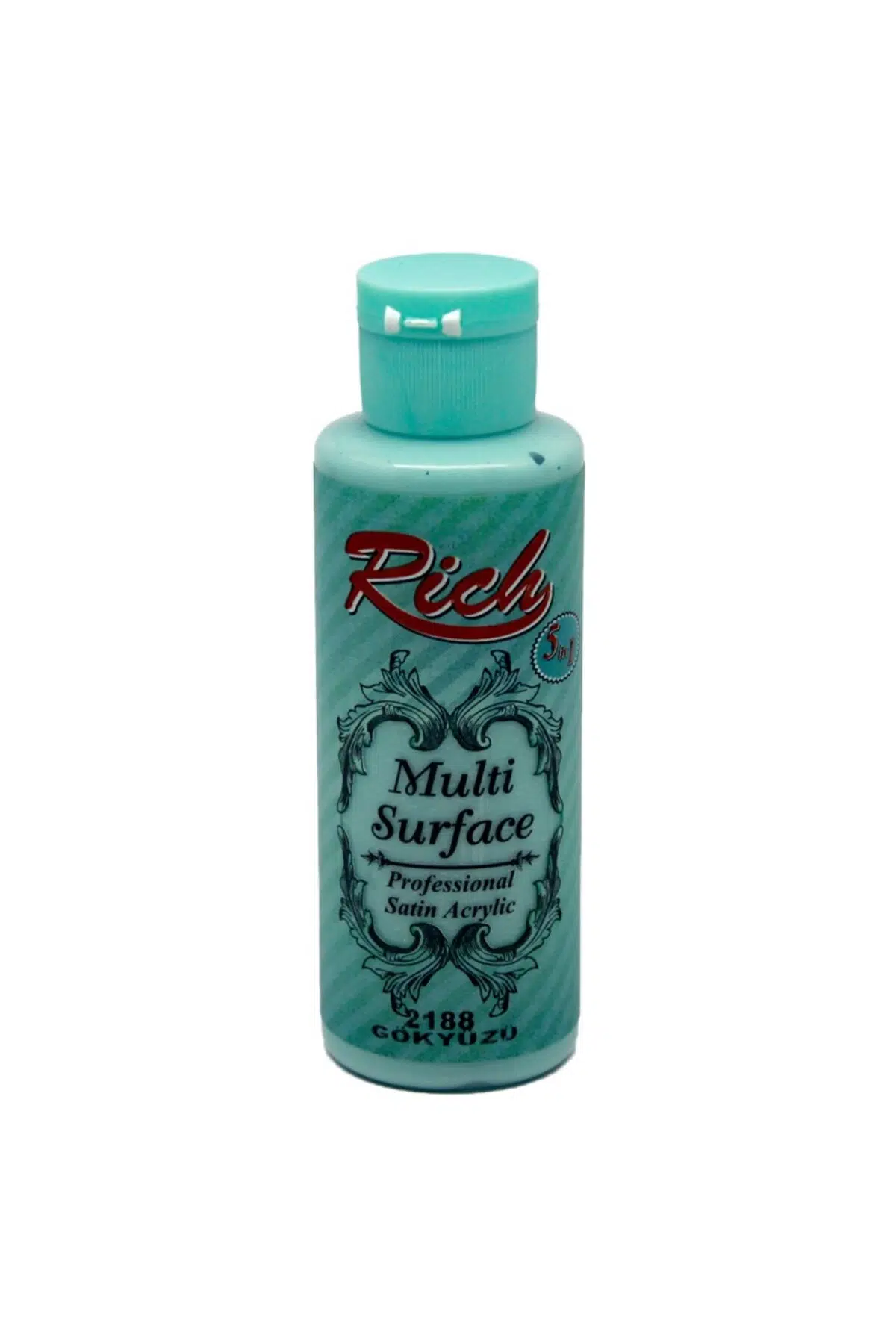 Rich Multi Surface 120 cc Gökyüzü 2188 Akrilik Boya Her yüzeyde kullanabileceğiniz Rich multi surface boyalar, hobi meraklılarının sıklıkla kullandığı bir üründür.; En kullanışlı Rich multi surface boyaya ulaşabileceğiniz internet sitemiz, çeşitli renk kataloğu ile siz değerli müşterilerimizin beğenisine sunuluyor.; Metal boyama, plastik boyama, ahşap boyama, kanvas boyama, seramik boyama, cam boyama, lake ve diğer birçok zeminde kullanılabilen Rich multi surface boya kataloğuna Bidoluhobi’den ulaşabilirsiniz.; En renkli tasarımlarınızı oluşturabileceğiniz Rich multi surface boyanın renk kartelası da oldukça zengin.; Dilediğiniz rengi mağazamızdan seçebilir ve tasarımlarınızı renklendirmenin keyfini çıkarabilirsiniz.; Tasarım yapanların ve el emeği ile figürler üretenlerin en önemli sorunlarından birisi olan renklendirme sorununun çözümü Rich multi surface boyalar ile çözülüyor.; Akmayan, kolayca kavlamayan ve kolay kullanımı ile boyama işlemini eziyet haline getirmeyen bu boyaya, Bidoluhobi portföyünden rahatça erişebilir ve güvenle sipariş verebilirsiniz.; Birçok yüzeyde kullanılabilen en kullanışlı Rich multisurface boya ile tasarımlarınızı renklendirebilir ve rahatlıkla sürebilirsiniz.; Hobicilerin en çok kullandığı ürünlerden birisi olan Rich multisurface boyalar, kolay kullanımı ile son zamanlarda çok revaçta olan bir ürün.; Hem Rich Multi Surface renk çeşitleri'ne hem de renk kartelasına göz atarak dilediğiniz rengi seçebilir ve politikamızdan faydalanarak en ucuz Rich Multi Surface boya sahip olabilirsiniz.; 120cc Rich multi surface boya ile yaklaşık 1-1.5 metrekare alan boyayabilir ve istediğiniz her yüzeyi renklendirebilirsiniz.; Multi Surface Boya Nasıl Uygulanır? Su bazlı multi surface boya metal, plastik, ahşap, kanvas, seramik, cam yüzeylere ince bir fırça yardımı ile direkt olarak uygulanabilir.; Siparişleriniz bidoluhobi tarafından özenle hazırlanır ve en kısa sürede ilgili kargo firmasına teslim edilir.