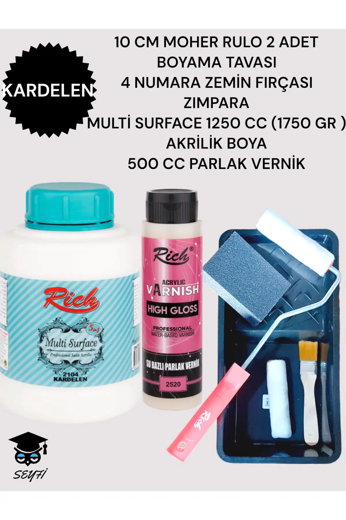 Rich Multi surface boyalarla eskiyi yenileyebilirsiniz! Mutfak dolabıboyama , zigon sehpalar, yemek odası takımı masa ve sandalye boyama, çelik kapı boyama, fayans boyama, genç odası boyama, oda kapısı boyama bunların hepsini ve daha fazlasını Rich Multisurface Her Yüzeye uygulanan boya ile zımparasız astarsız hiç boyama bilmeseniz bile kolaylıkla uygulayabilirsiniz; 1/4 oranında sulandırıp ilk kat sürülür 24 saat sonra ikinci kat uygulanır ve Rich su bazlı vernikle ürün korumaya alınır; Uygun ve hesaplı ev yenileme tamamen elinizde! İçindekiler : 1 Adet 1250cc Rich multisurface boya, 500cc su bazlı parlak vernik, Sentetik uçlu yumuşak fırça, yardımcı boyama yapmanız için rulo ve malzemeler; ;;