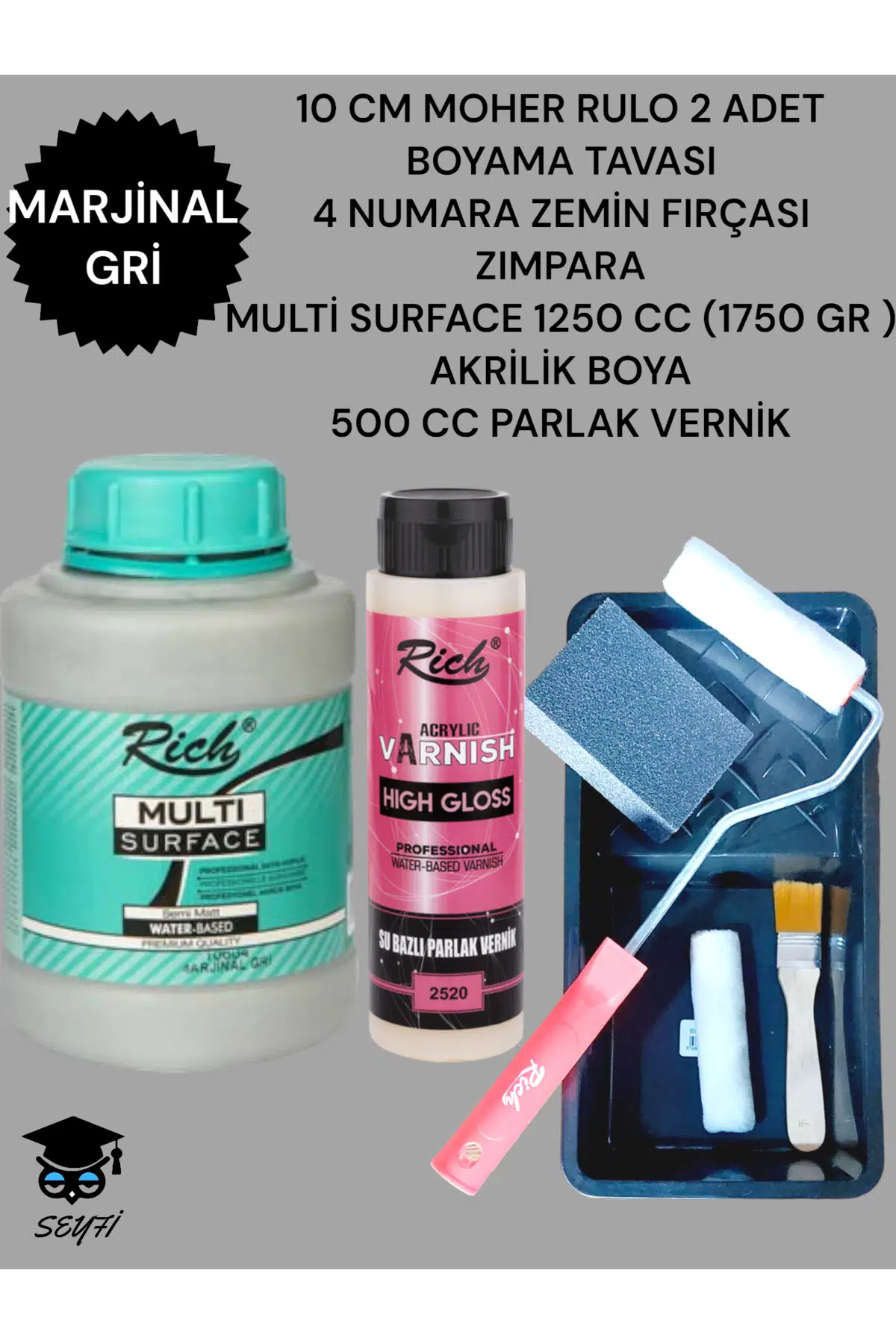 Rich Multi surface boyalarla eskiyi yenileyebilirsiniz! Mutfak dolabıboyama , zigon sehpalar, yemek odası takımı masa ve sandalye boyama, çelik kapı boyama, fayans boyama, genç odası boyama, oda kapısı boyama bunların hepsini ve daha fazlasını Rich Multisurface Her Yüzeye uygulanan boya ile zımparasız astarsız hiç boyama bilmeseniz bile kolaylıkla uygulayabilirsiniz; 1/4 oranında sulandırıp ilk kat sürülür 24 saat sonra ikinci kat uygulanır ve Rich su bazlı vernikle ürün korumaya alınır; Uygun ve hesaplı ev yenileme tamamen elinizde! İçindekiler : 1 Adet 1250cc Rich multisurface boya, 500cc su bazlı parlak vernik, Sentetik uçlu yumuşak fırça, yardımcı boyama yapmanız için rulo ve malzemeler; ;;