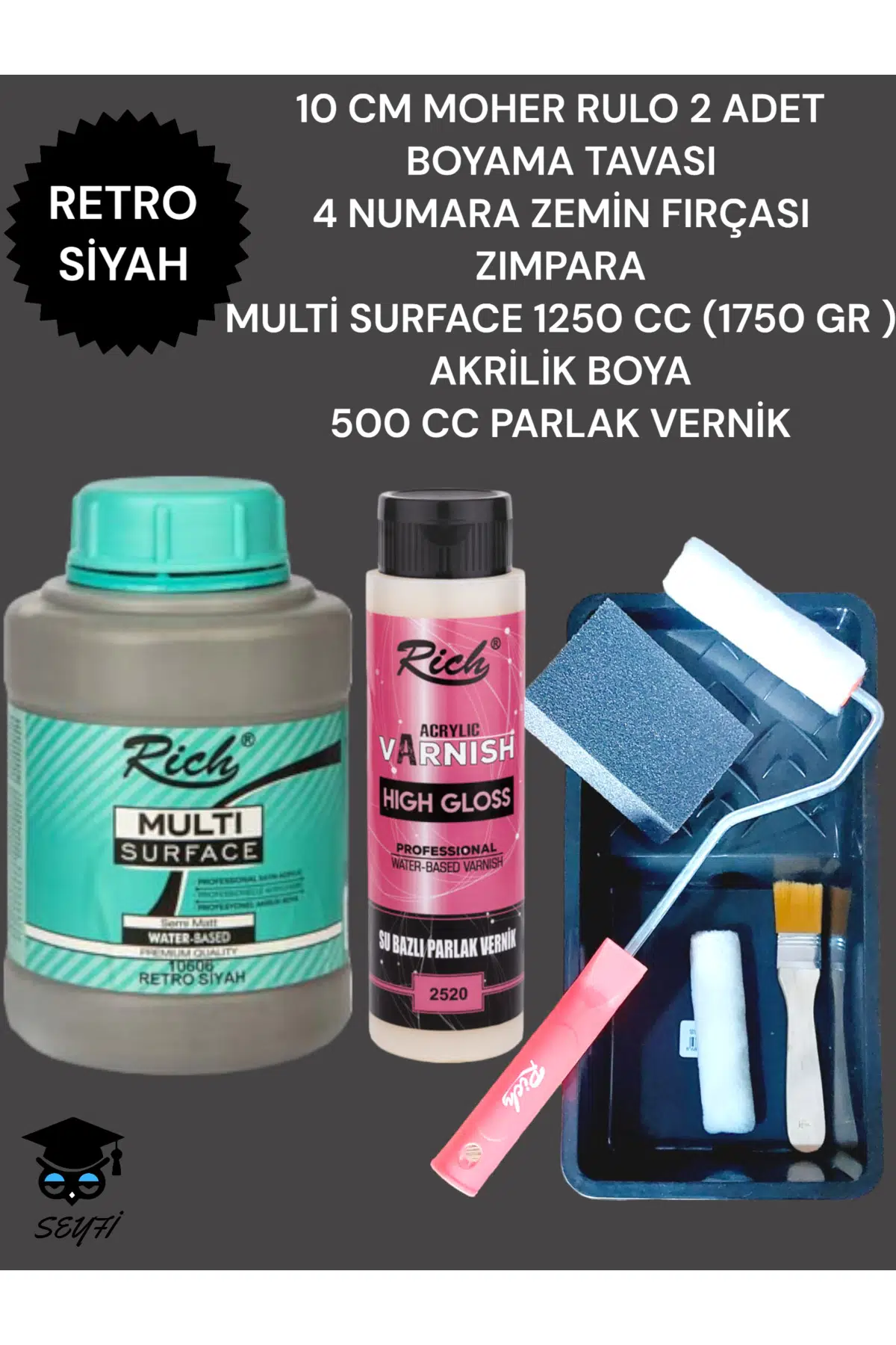 Rich Multi surface boyalarla eskiyi yenileyebilirsiniz! Mutfak dolabıboyama , zigon sehpalar, yemek odası takımı masa ve sandalye boyama, çelik kapı boyama, fayans boyama, genç odası boyama, oda kapısı boyama bunların hepsini ve daha fazlasını Rich Multisurface Her Yüzeye uygulanan boya ile zımparasız astarsız hiç boyama bilmeseniz bile kolaylıkla uygulayabilirsiniz; 1/4 oranında sulandırıp ilk kat sürülür 24 saat sonra ikinci kat uygulanır ve Rich su bazlı vernikle ürün korumaya alınır; Uygun ve hesaplı ev yenileme tamamen elinizde! İçindekiler : 1 Adet 1250cc Rich multisurface boya, 500cc su bazlı parlak vernik, Sentetik uçlu yumuşak fırça, yardımcı boyama yapmanız için rulo ve malzemeler; ;;