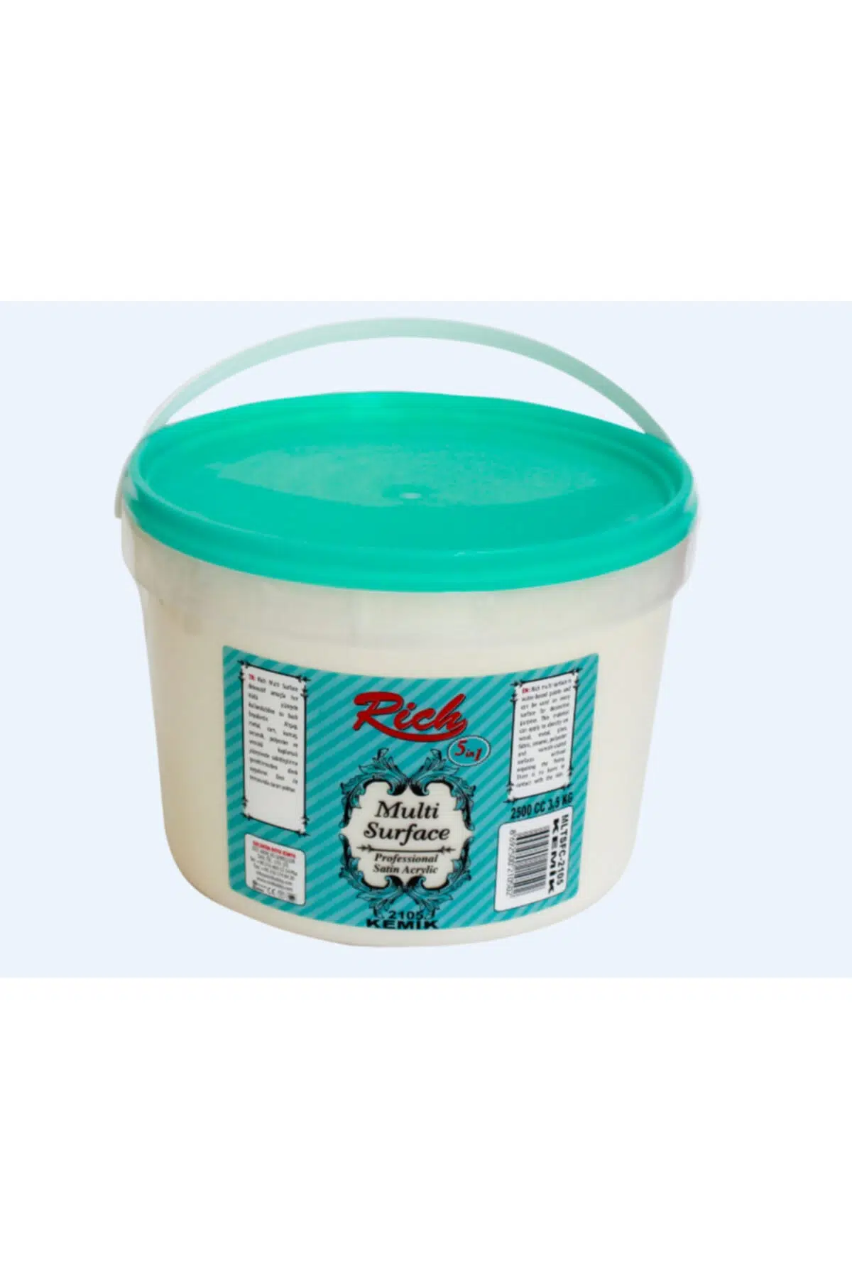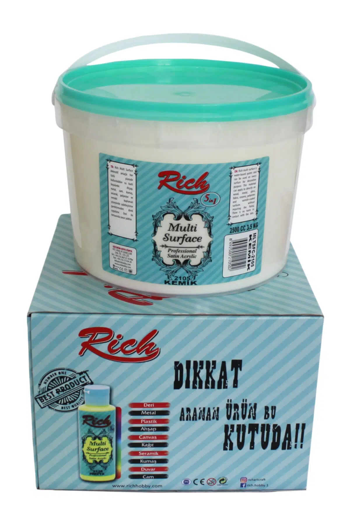 Rich Multi Surface Akrilik Boya * Her türlü yüzeye (ahşap, cam, metal, plastik, seramik, kumaş, polyester vs) uygulama yapabileceğiniz, su bazlı akrilik hobi boyasıdır.; ; * Su bazlıdır, kokusuzdur, deri ile temasında sorun yoktur.; ; hızlıca kurur, zımparalama ve astar istemez.; ; * Üstün örtücülük ve yüksek pigment yapısı özelliğinden dolayı mobilya dönüşüm ve ev aksesuar boyaları arasında en çok tercih edilen boya türüdür.; ; * Ham mdf ve cilalı parlak mobilyalarınızda yüzey astarı gerektirmeksizin, uygulama yapabilir.; ; * Cam üzeri çalışmalarınızda mükemmel örtücülük ve fırınlanmadan elde ve makinada yıkayabilirsiniz.; ; * Kumaş boyama çalışmalarınızda, boyadığınız kumaşı elde ve makinada yıkayabilirsiniz.; ; * Seramik boyama çalışmalarınızda, dekoratif duvar boyama çalışmalarınızda, kanvas tuvallerinizde, her türlü kâğıt ve karton üzeri boyama çalışmalarınızda kullanabilirsiniz.;