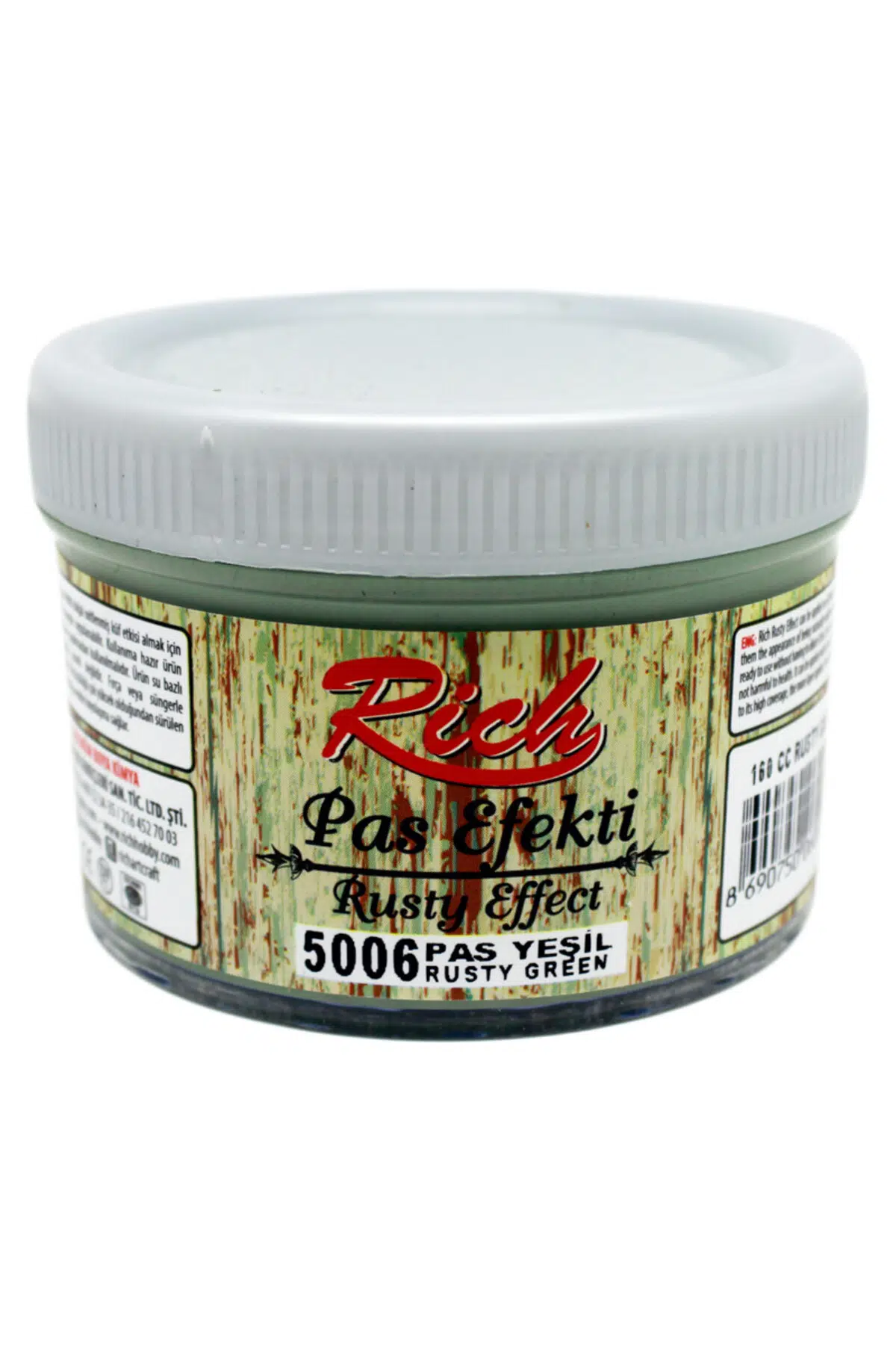 Rich Pas Efekti 150 cc Pas Yeşil 5006 Rich pas efekti doğal oksitlenmiş küf etkisi almak için her türlü yüzeye uygulanabilir.; Kullanıma hazırdır inceltme yapılmadan kullanılması tavsiye edilir.; Pas Efekti boyalar ahşap hobi malzemelerinin boyanmasında olmazsa olmaz bir ürün grubu haline gelmiştir.; Pas efekti boyalar kullandığınız alanda paslanmış ve eskimiş bir görüntü vermektedir.; Birçok alanda kullanıma uygun olan pas efekti boyaları inceltme yapmadan kullanmanız tavsiye edilmektedir.; Pas Efekti boyaları kullanmadan önce kullanacağınız alana ister kabartma şekilde oymalar, isterseniz zemin oluşturmak için farklı materyaller kullanabilirsiniz.; Pas efekti boyalar yoğun gruplu boyalardan olduğu için kullandığınız zemini rahatlıkla kapatacaklardır.; İsteğe göre kullanmadan önce yüzey ince bir zımparayla zımparalandıktan sonra, hafif nemli bir bezle silinebilir.; Silindikten sonra Pas efekti boyanız bir kat sürülür ve kurumaya bırakılır.; İhtiyaca göre 2 kat da sürebilirsiniz.; Katlar arasında 6-8 saat beklemeniz tavsiye edilmektedir.; Siz de daha fazla hobi boyama malzemesi için mağazamızın ürün kataloğunu gözden geçirebilirsiniz.